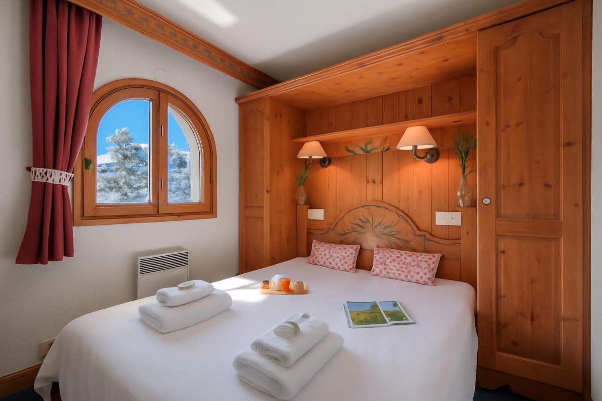 A gorgeous Master bedroom decorated in the timeless ski chalet charm and featuring a Double bed, a wardrobe and ambient reading lights features. There is also a Single sofa bed for a 3rd guest, in the Living room.