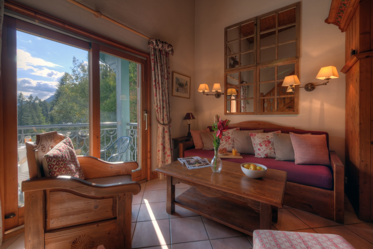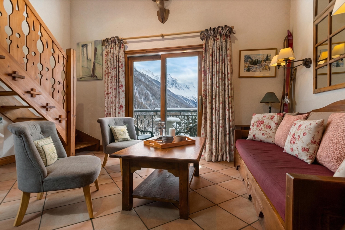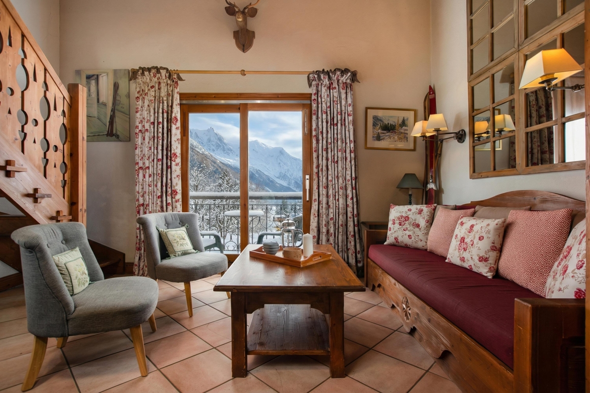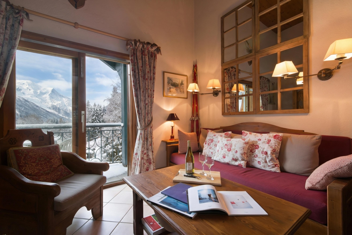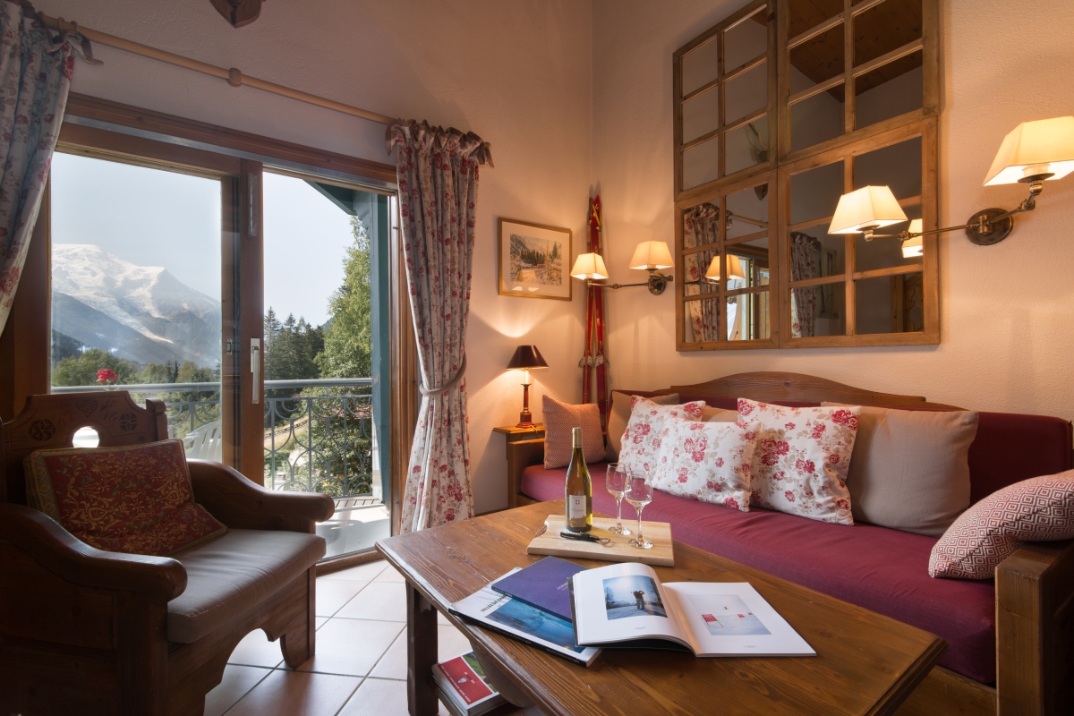 Guests can easily relax or entertain within the timeless romance of the living space. Furnished with a cosy sitting area, flat screen TV, the scene sets an inviting and laid-back feeling of home. French doors lead out on to a private balcony with a direct southerly view of Mont Blanc and the Aiguille du Midi, and overlooking the protected Aiguilles Rouges Natural Reserve to the side of the residence, providing a peerless spot from which to enjoy an alfresco meal, a good book or a holiday daydream.
