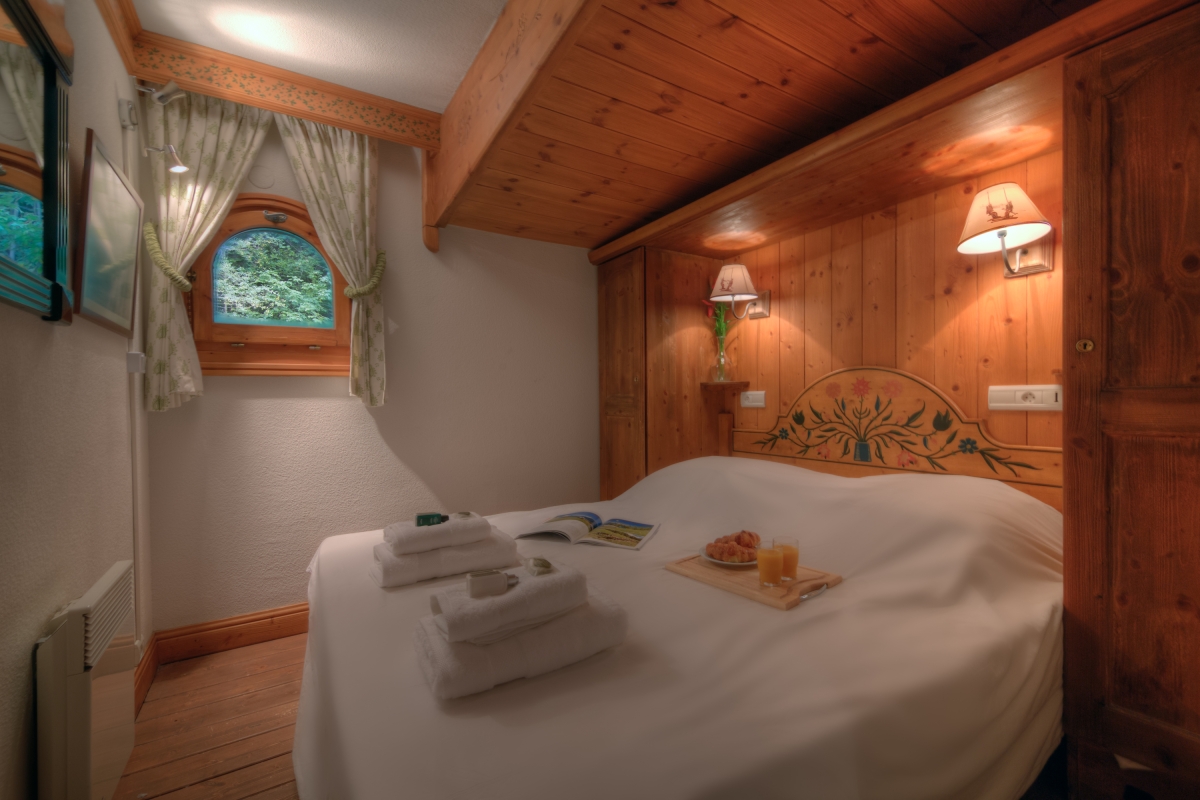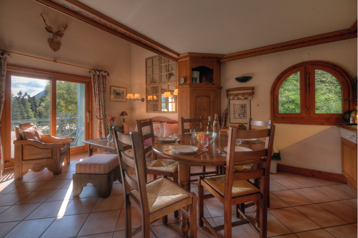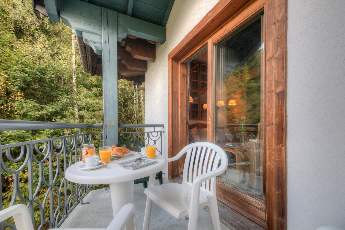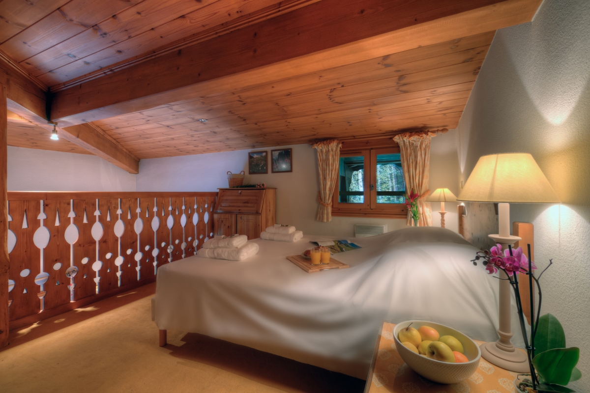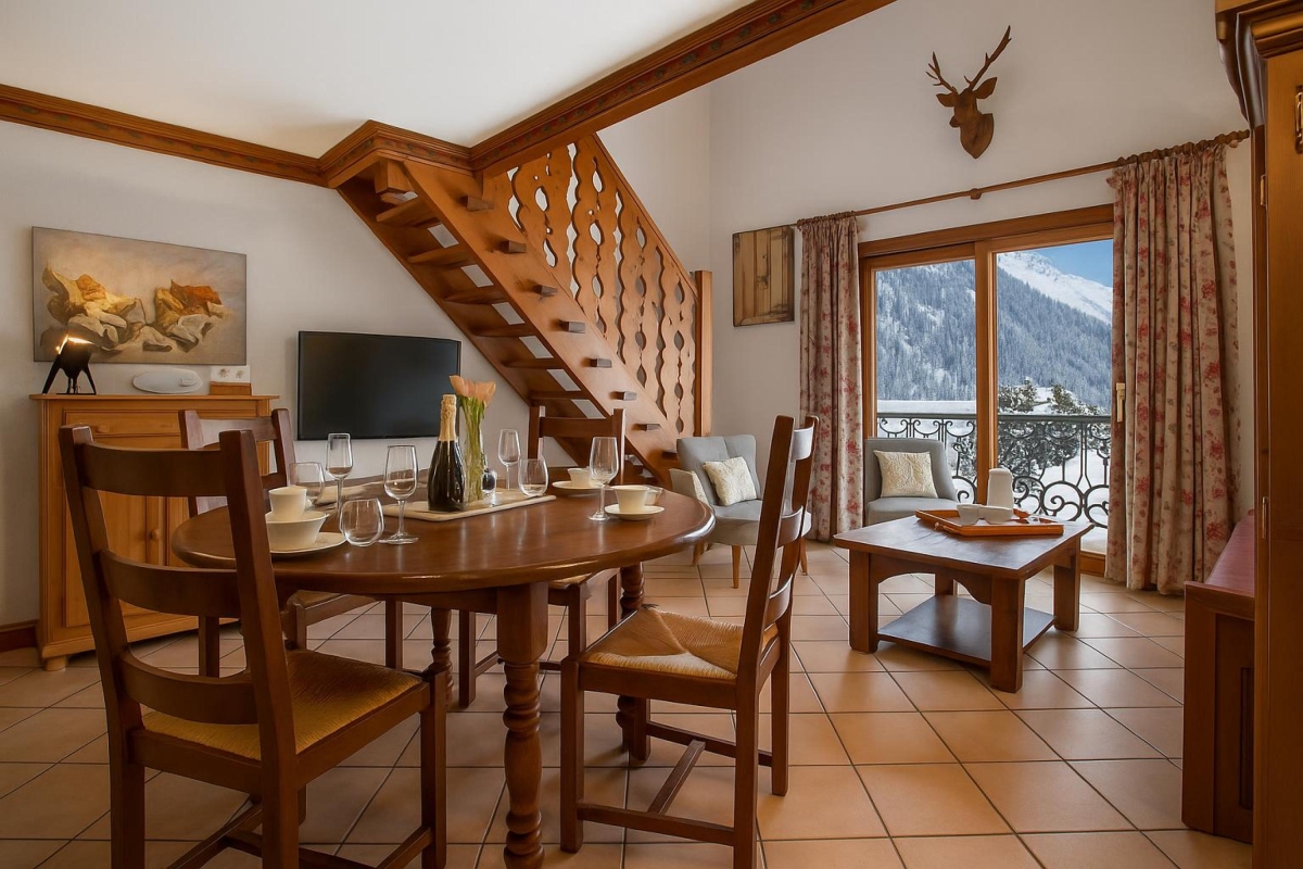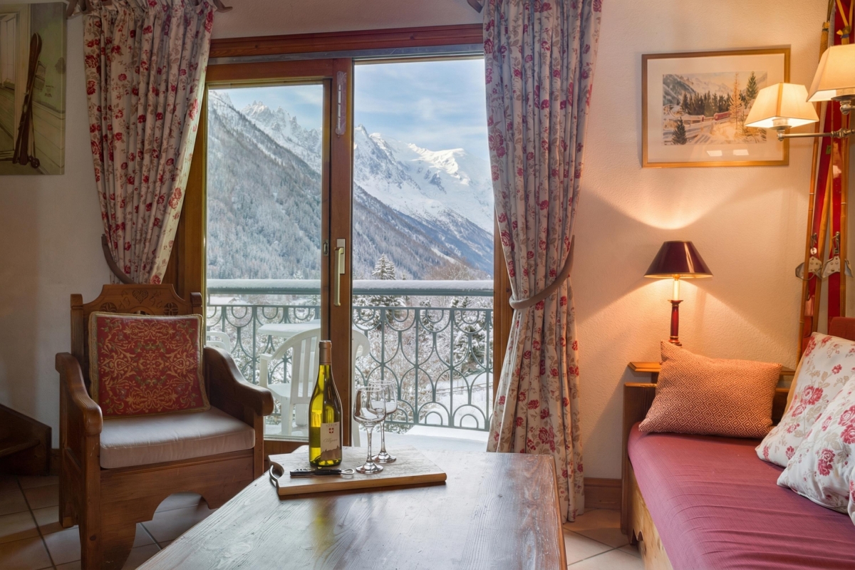 Guests can easily relax or entertain within the timeless romance of the living space. Furnished with a cosy sitting area, flat screen TV, the scene sets an inviting and laid-back feeling of home. French doors lead out on to a private balcony with a direct southerly view of Mont Blanc and the Aiguille du Midi, and overlooking the protected Aiguilles Rouges Natural Reserve to the side of the residence, providing a peerless spot from which to enjoy an alfresco meal, a good book or a holiday daydream.