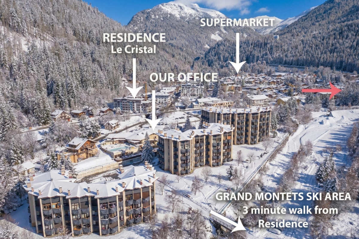 LE CRISTAL is situated in the centre of the village, opposite the train station and bus stops, with cafes, restaurants and shops close by and the main ski lifts 8 minutes’ walk away.