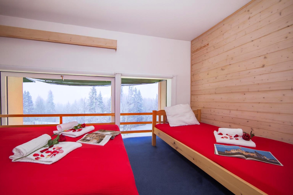 Bedroom 1: A flexible family bedroom with Double bed + 1 Single bed, leading through to Bedroom 2.