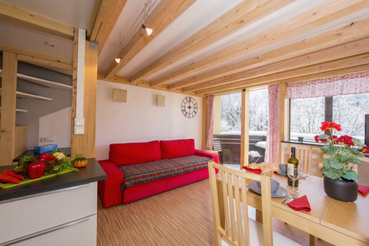 Situated in a natural riverside setting along ‘Chemin sous la Grand’ at the entrance of the village, guests are conveniently placed for reaching a local Pizza restaurant (1-minute walk), the Les Grands Montets ski lift (230 mt walk away) and the nearby train station.