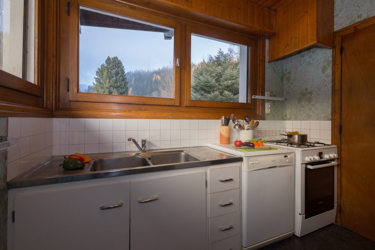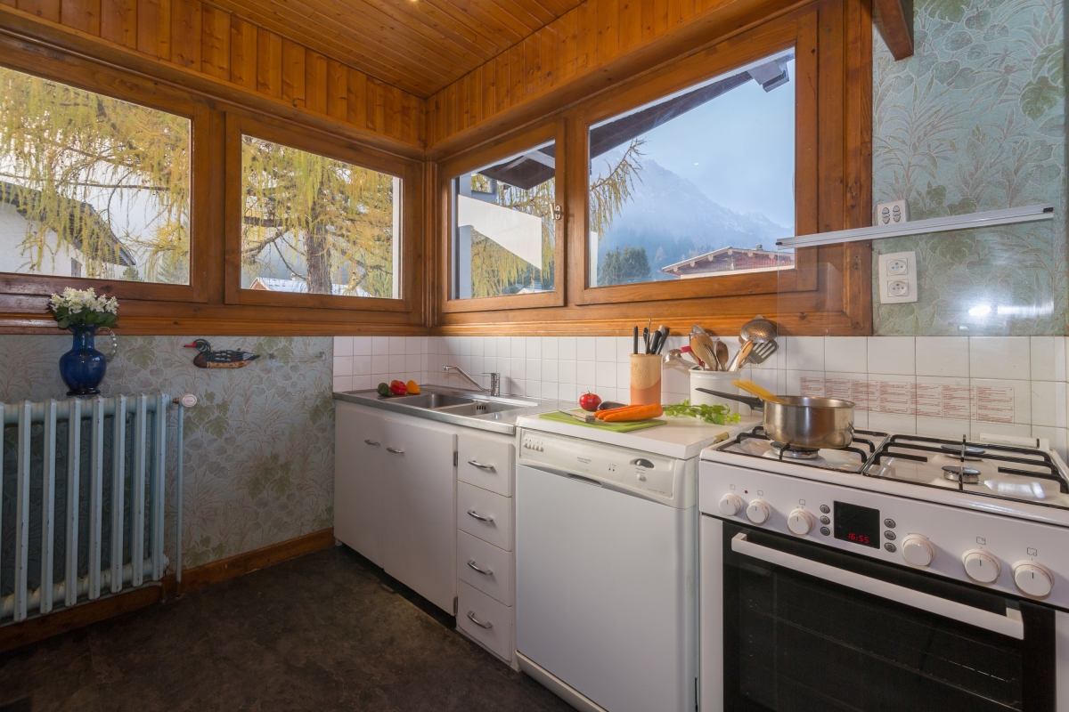 The timeless 2-storey chalet boasts a magnificent mountain view back drop from the picture window of the Living room. Furnished with a sitting area, flat screen TV and a classic chalet-style dining area, the traditional interior provides a welcoming ambience in which to kick back and entertain. The sitting room also leads through to a separate Kitchen. Equipped with a cooker hob, microwave, oven, electric kettle, drip coffee machine, toaster, dishwasher and fridge freezer, the Kitchen is ready and waiting to help guests prepare tasty meals and snacks.