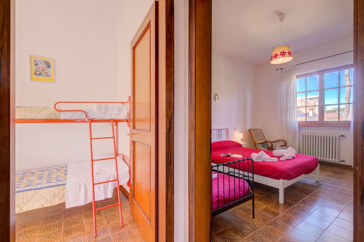 To the 1st floor a spacious family-friendly master bedroom with balcony, king-size bed and extra single bed features. Guests will also find a 2nd couple-friendly bedroom with a king-size double bed and a 3rd child-friendly bedroom with a set of bunk beds and Juliette balcony. Downstairs, a double sofa bed for 2 guests can also be utilised in the living room.