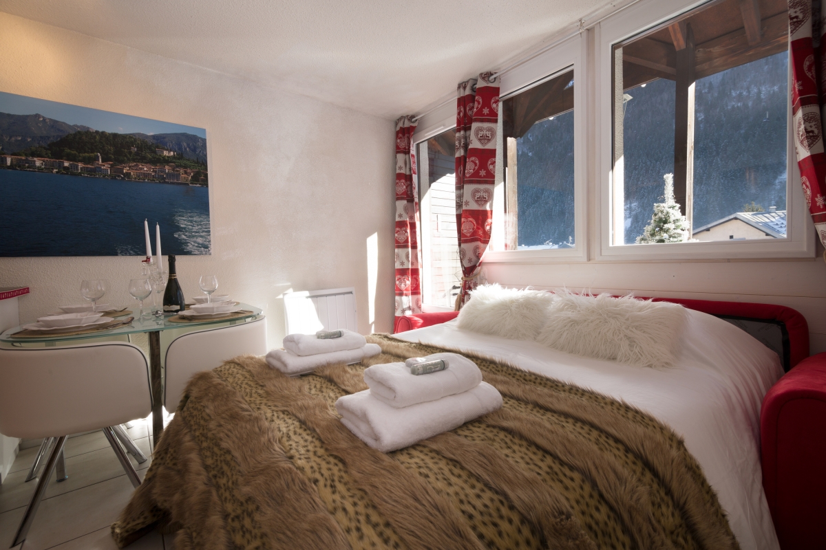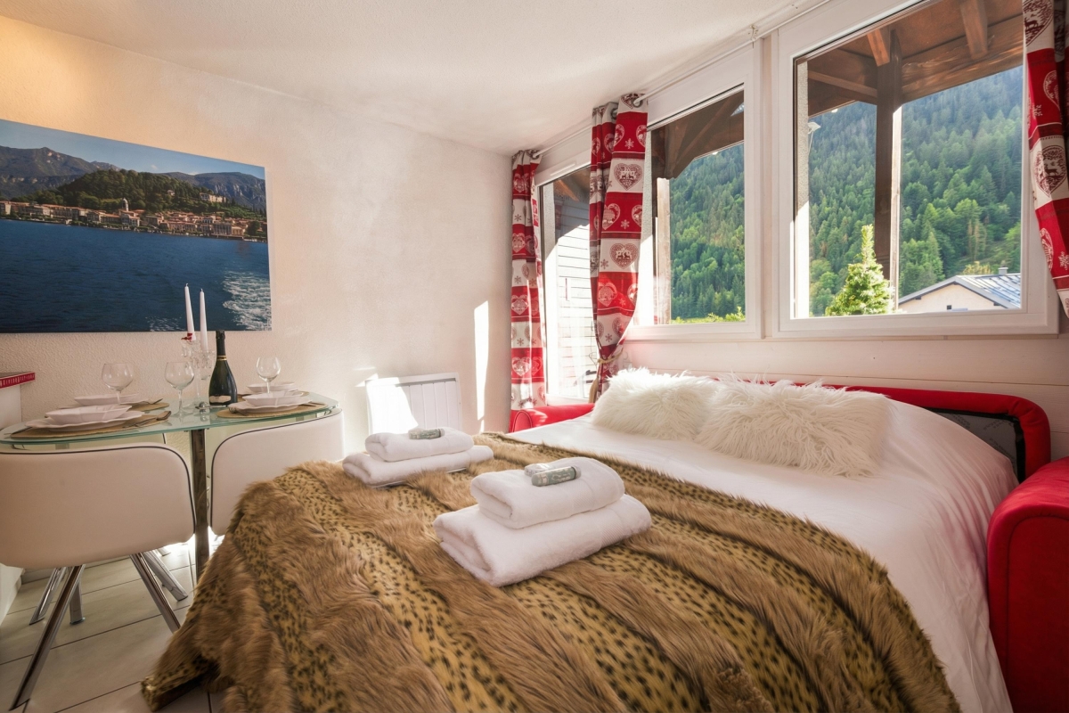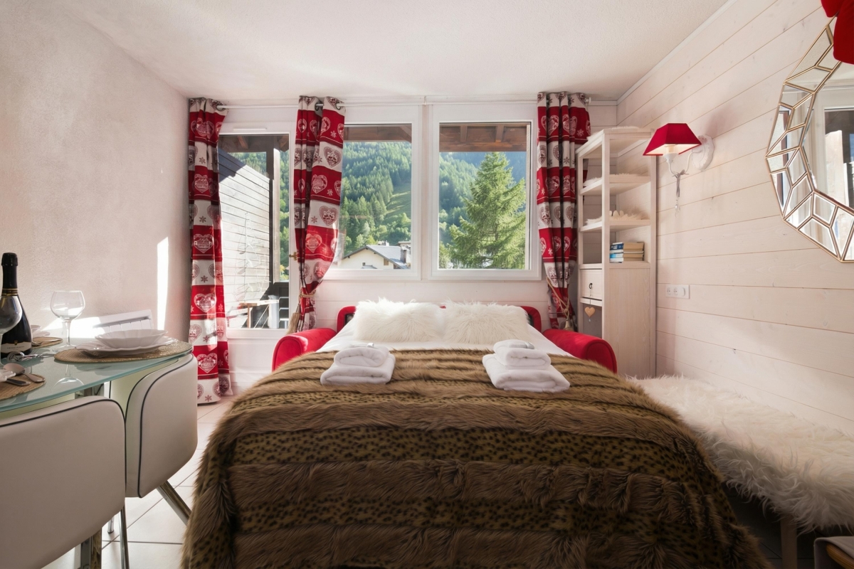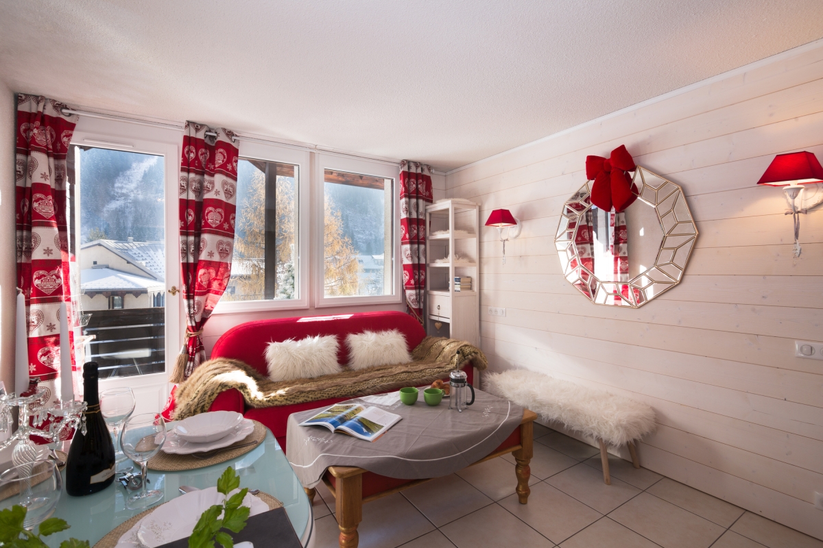A cute and captivating interior can be enjoyed in the open plan Living room, which features a lovely sitting area, a flat screen TV, Kitchen Diner and a private balcony overlooking the beautiful Mont Blanc and a peaceful area of the resort.