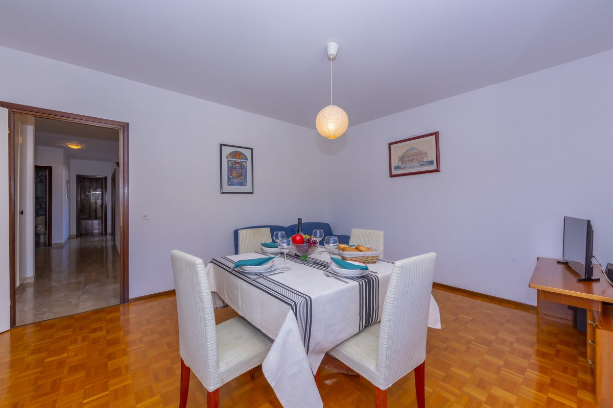 The 14th floor apartment is easily reached by lift, and inside features a spacious Living room furnished with a TV, sofa, a dining area and balcony access, alongside a separate retro-fitted Kitchen equipped with a cooker hob, electric kettle, toaster and dishwasher. A generous couple-friendly Double bedroom is accompanied by a spacious 2nd bedroom, furnished with two Single beds.