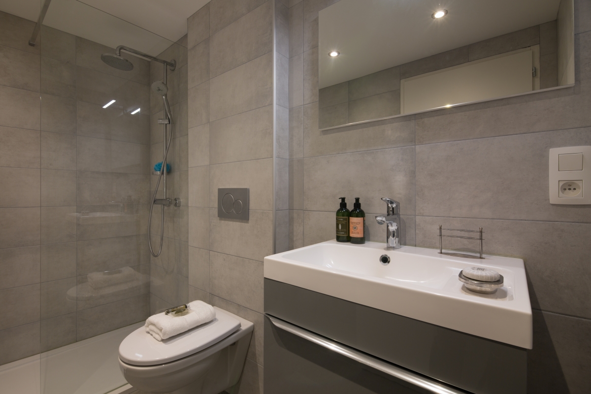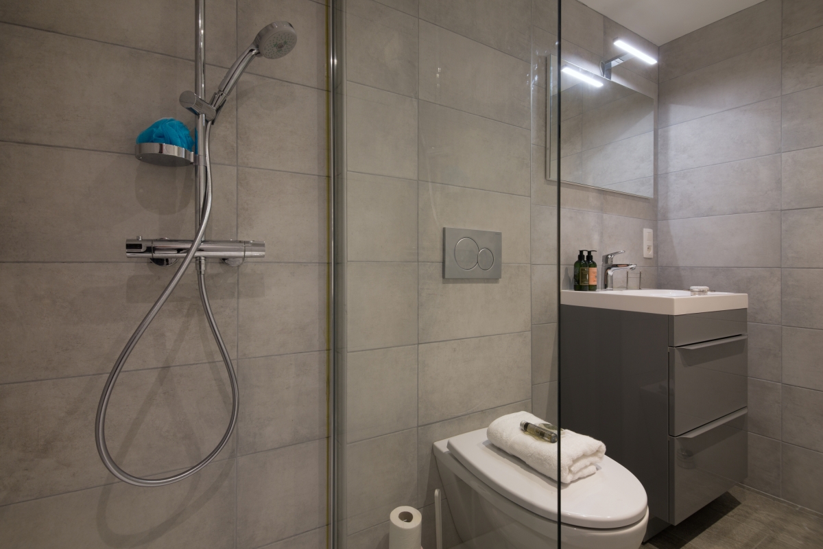 Next to the welcoming Living space is a stylish Master Double bedroom with wardrobe. The comfortable room is ideally suited for a couple looking to enjoy a good night’s sleep during their stay. Accompanying the Double bedroom is a chic modern bathroom with walk-in shower, wash basin and WC.