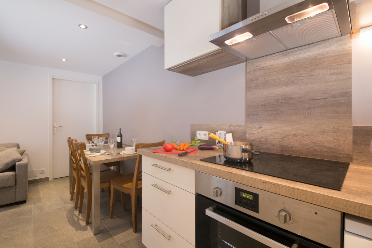 Inside, the WiFi-enabled apartment has been beautifully updated to provide guests with a calm and contemporary self-catering experience. A spacious spot-lit Living room provides a sumptuous sofa with flat screen TV, a dining area and a fully-equipped modern Kitchen.