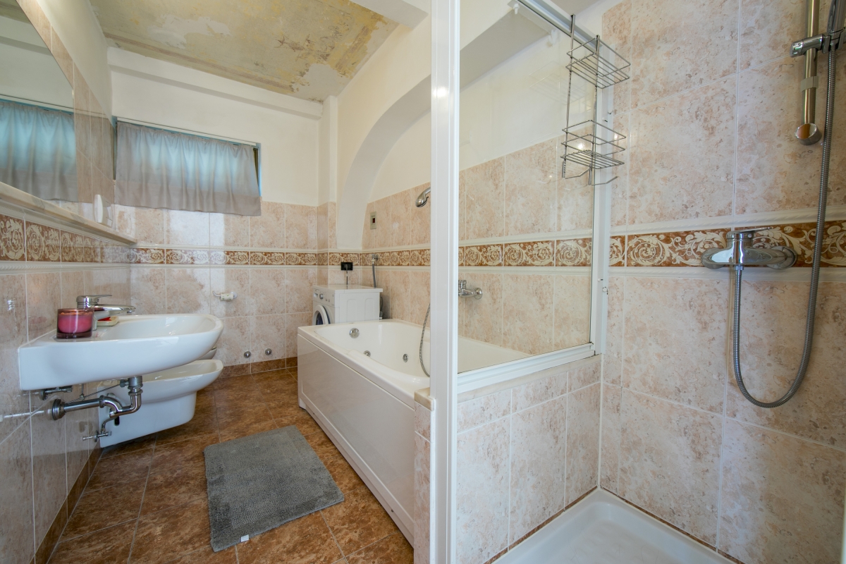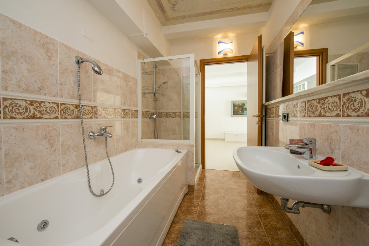 The main modern family bathroom also features a partial alfresco ceiling and is equipped with a bath tub and shower tap, a separate shower cubicle, a wash basin, a WC and bidet.