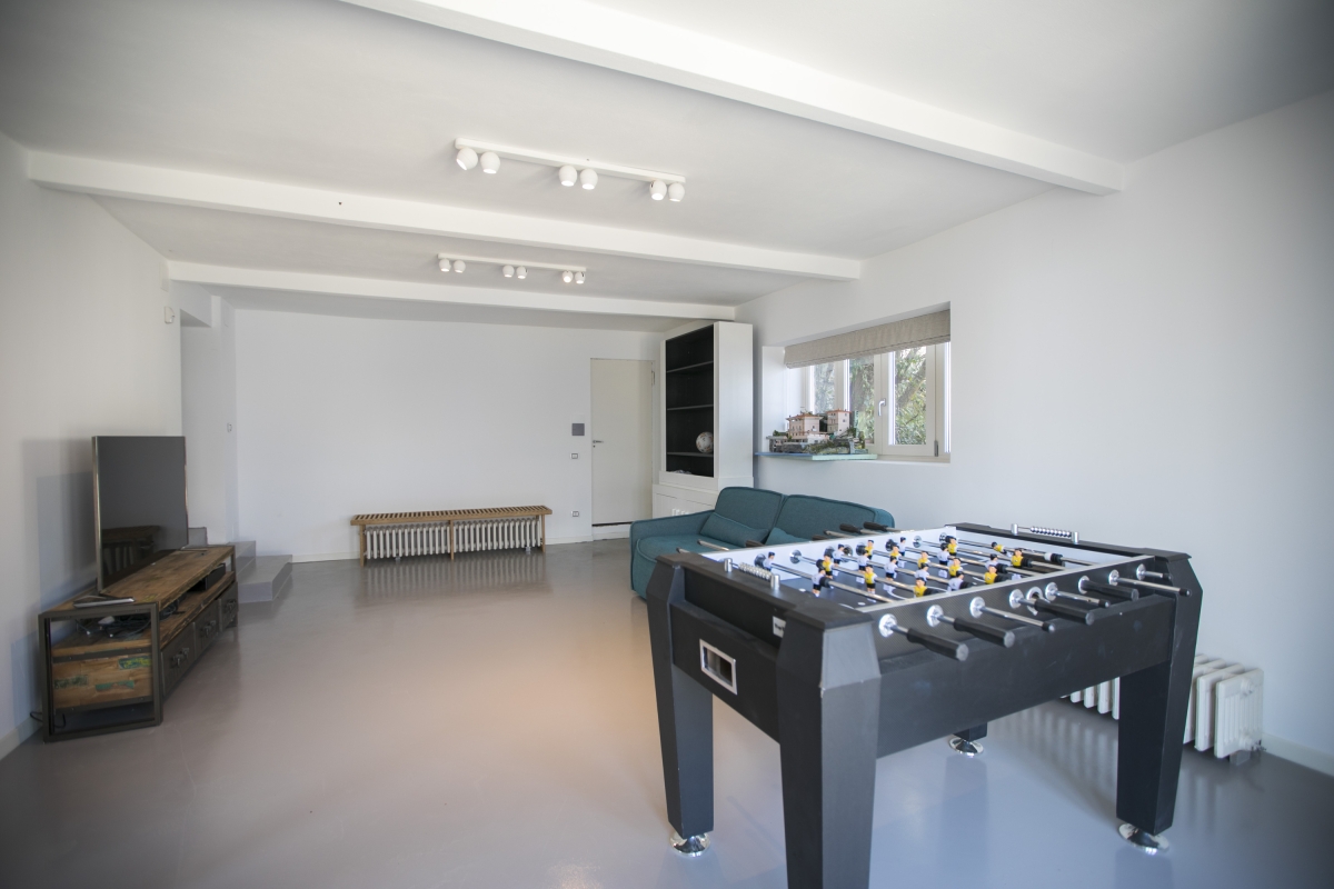 A lower ground floor play room offers added space and amusement for families and young guests.