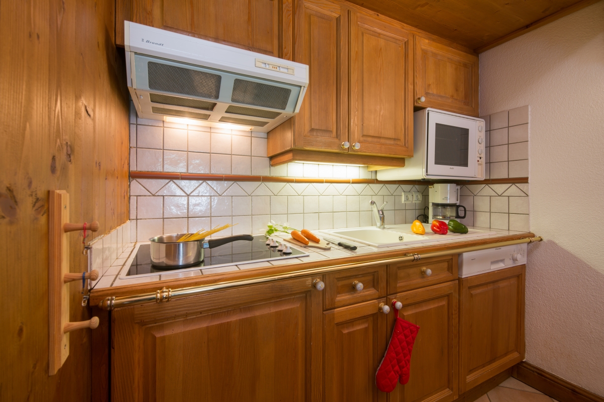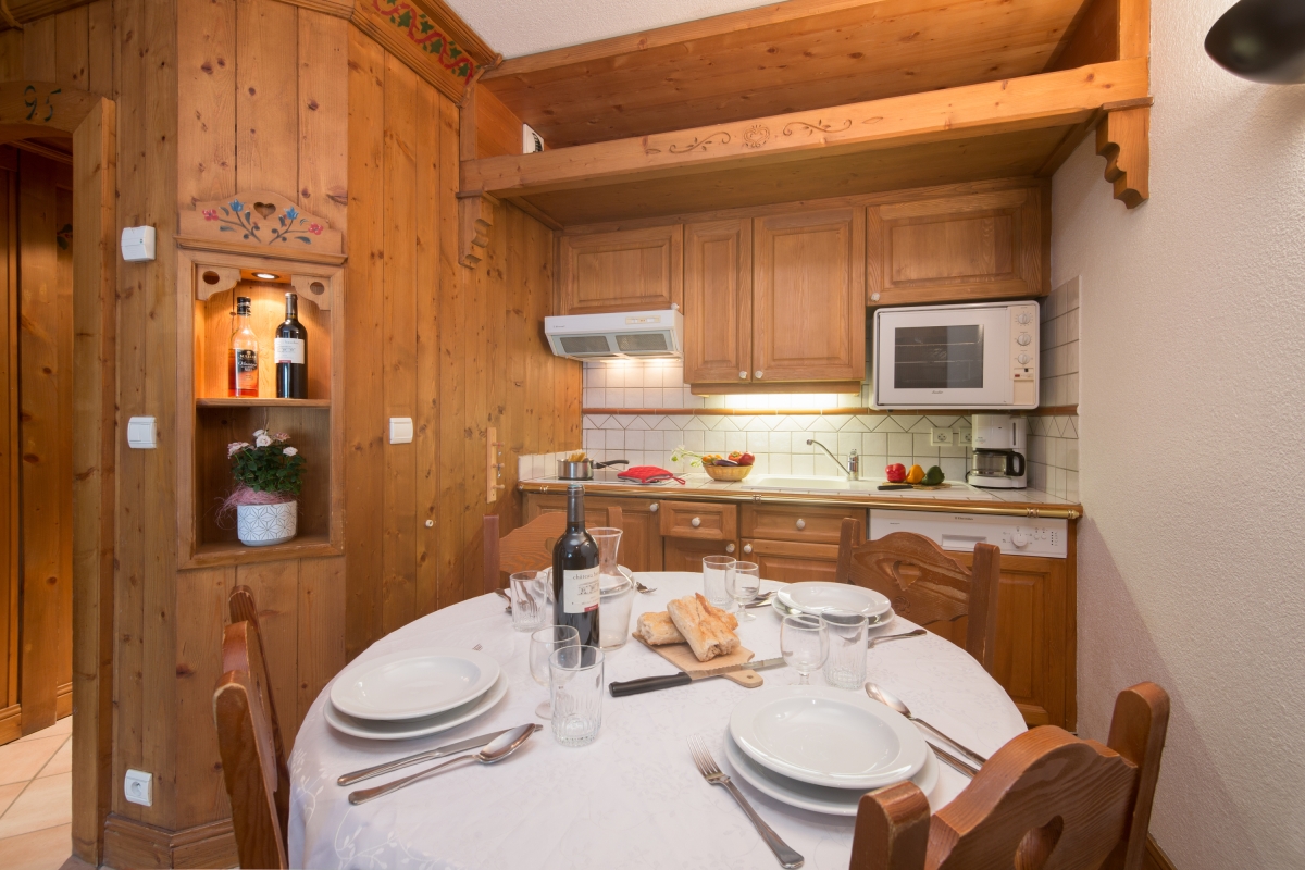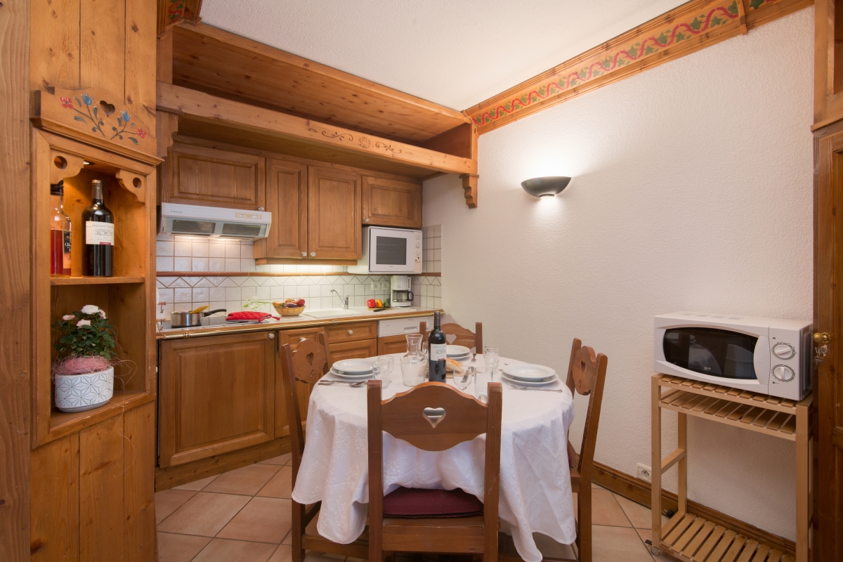 The 2nd floor apartment is easily reached by lift and inside benefits from a classic dose of French Alps charm. The small yet-perfectly-formed layout comprises of a cosy open plan living room with sofa, TV, adjoining kitchen diner and access to a mountain view balcony with bistro table for 2. A double bedroom features alongside a compact corner cabin with child-friendly bunk beds, a family bathroom with tub and shower, a WC and private sauna.