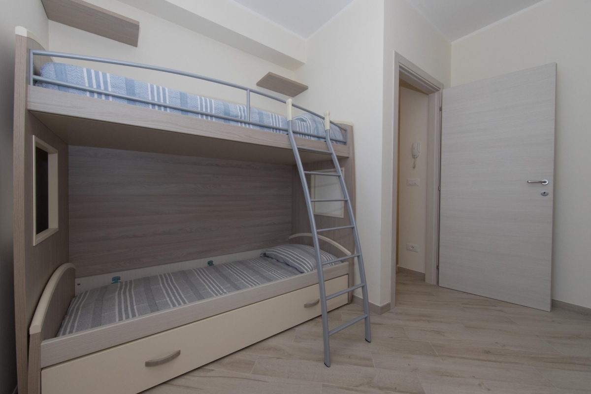 Bedroom 2: A modern family room with bunk beds, a single bed & wardrobe