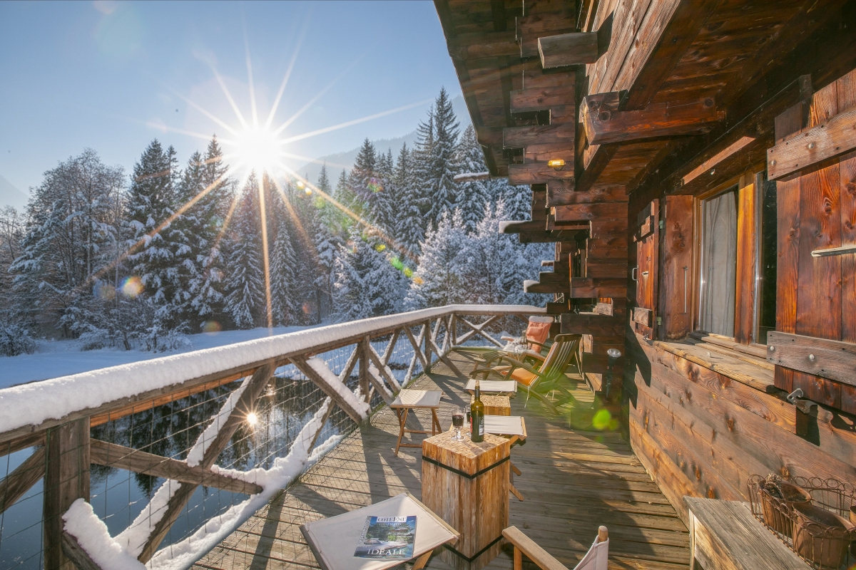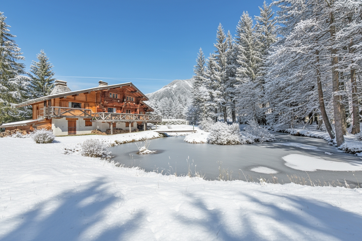 Poised and ready for fabulous ski breaks and summertime getaways, this modern chalet for 14 enjoys a unique and enticing natural setting, surrounded by a private garden with lake.