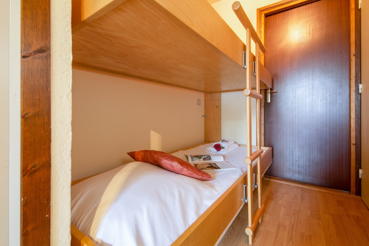Open living space: A small double sofa bed for 1 person is accompanied by bunk beds in the entrance hallway