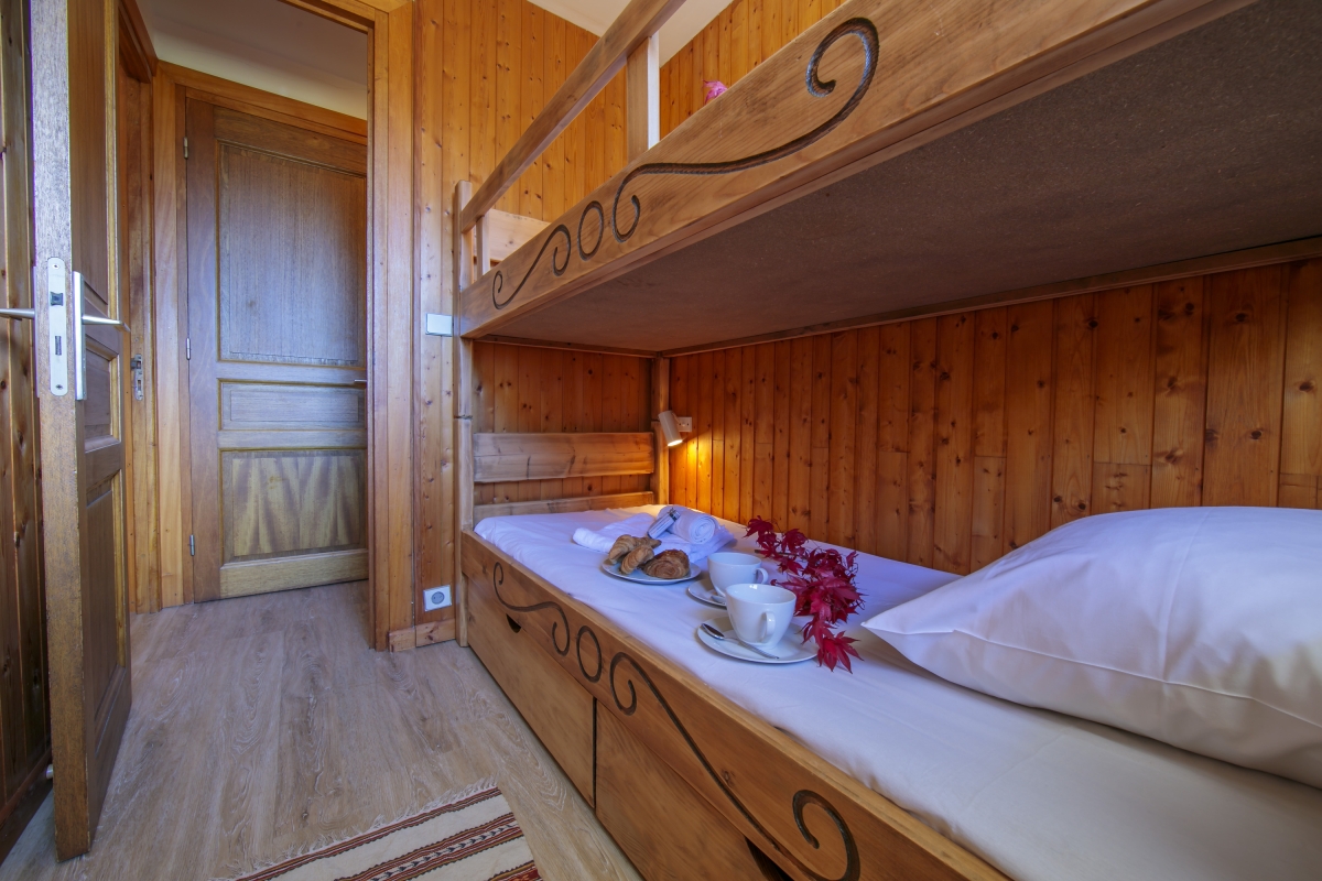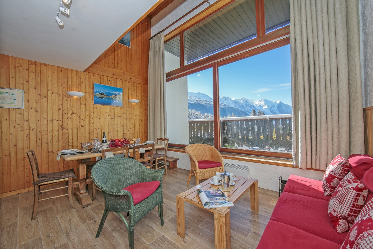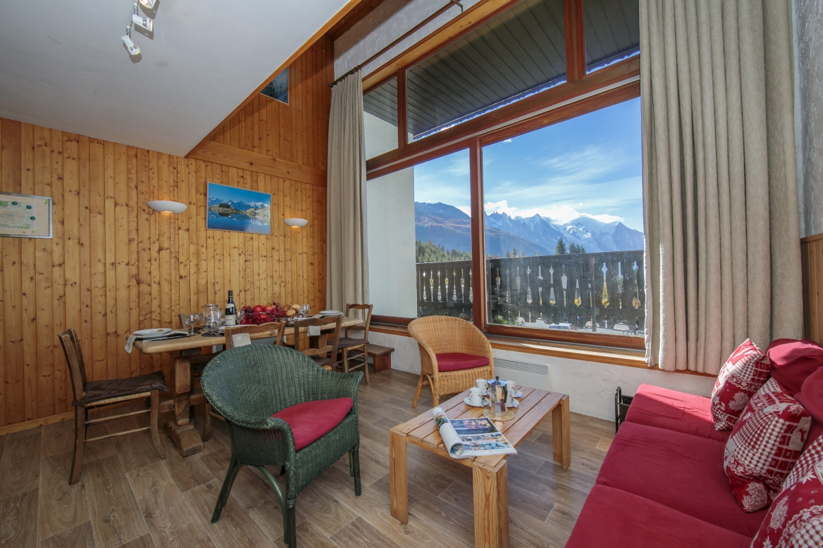 The 4-storey chalet boasts a sunny south-facing aspect, with glorious views of Mont Blanc to enjoy. The family-friendly interior is equipped with free WiFi and is traditional in style, with a spacious open plan living room with large picture window furnished with a comfy sofa suite, a TV, accompanying dining area and adjoining kitchen. The living room also leads out to a sunny private Mont Blanc-view balcony, as well as up to an open mezzanine floor, used as a casual extra living space/TV room.