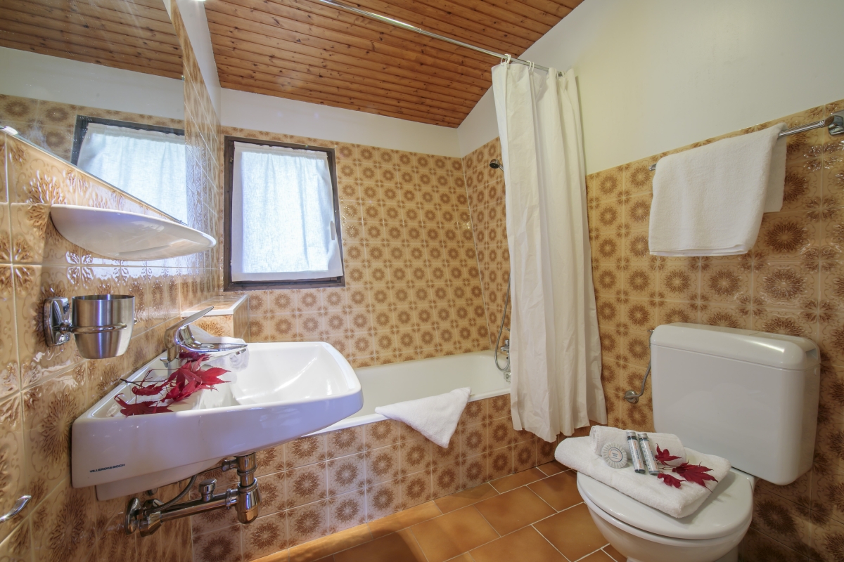 Bathroom 1: A retro-fitted family suite with bath tub, overhead shower, wash basin & WC