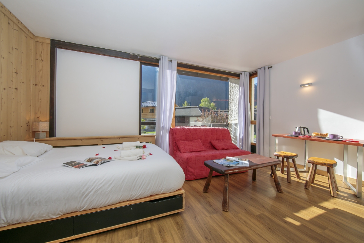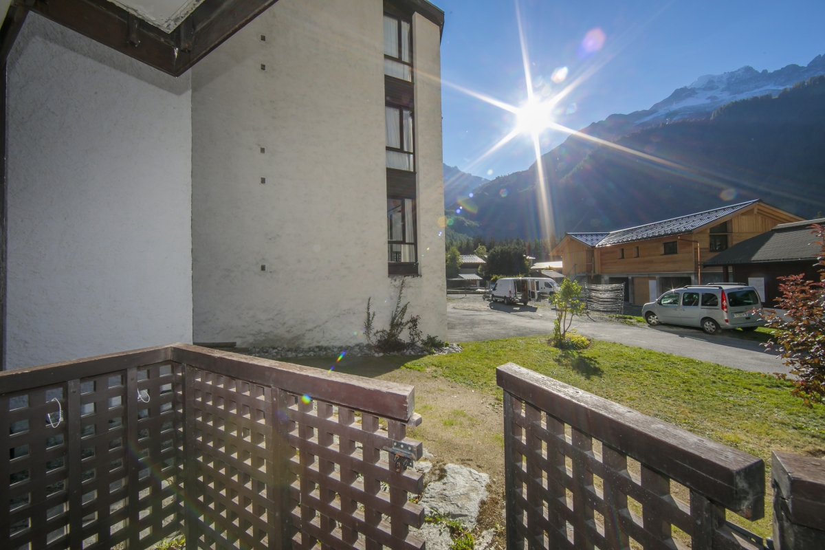 This light and airy updated Studio perfectly serves as a restful holiday location for 1-2. Inside, a large picture window with views of the Les Grands Montets mountain offers a scenic backdrop to the open plan living space, which is equipped with a sofa, a wall-mounted TV with DVD player, a small breakfast table, a study/dining area and a recently fitted new kitchenette. The living area is furnished with a double bed and provides access to a small sunny balcony, and the communal garden beyond. A contemporary-fitted shower room completes the internal layout of this charming and accessible ground floor Studio.