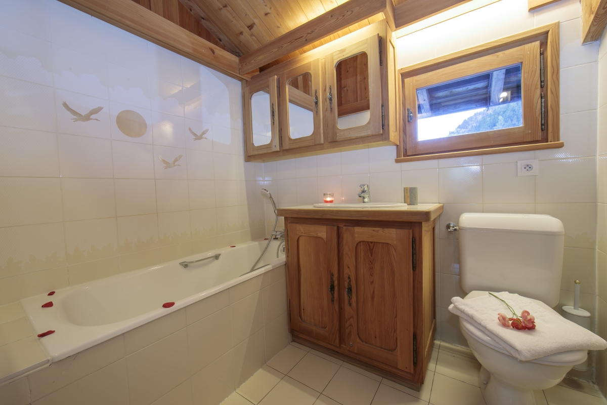 Inside, the 2-storey chalet is fully WiFi-enabled and comprises of a gorgeous living room with double aspect mountain views, a flat-screen TV and an ambient fireplace to curl up with on the sofa. Three steps lead to a fully-equipped kitchen diner. The inviting floor features a rustic beamed ceiling and a cosy wintertime atmosphere, for tempting moments in. A flight of open tread stairs leads up to a spacious master bedroom with double bed and balcony access, alongside a 2nd double bedroom and a third child-friendly bedroom with bunk bed. A traditional family bathroom suite with bath tub and overhead shower is accompanied by a 2nd shower room with WC. Private laundry facilities and ski storage promise added convenience whilst away.
