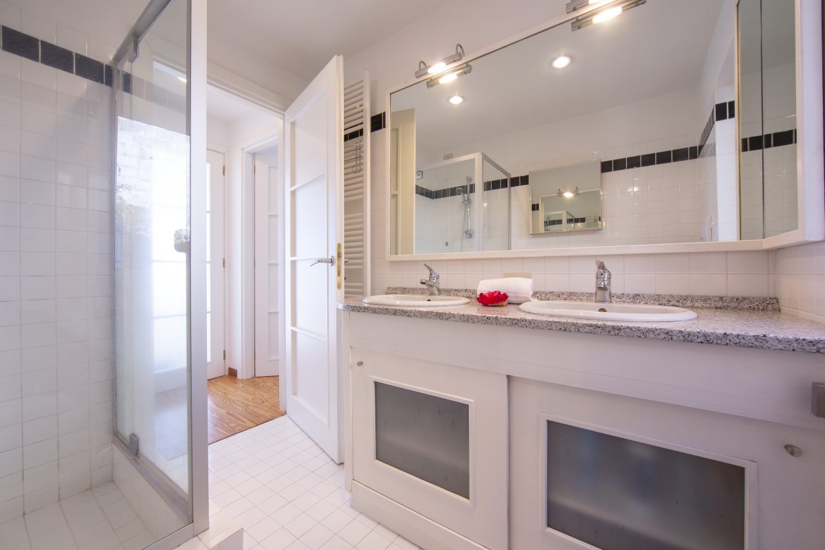 Bathroom 1: Contemporary fitted suite with a shower cubicle, wash basin, WC & bidet