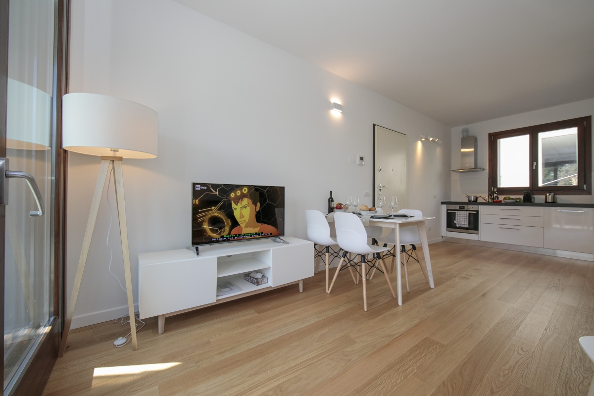 Inside, lake view apartment sets the scene for an effortless holiday. A gorgeous lake view living room with terrace creates a laid-back layout, perfect for year-round entertaining and relaxation. A flat screen TV is accompanied by a chic l-shaped double-size sofa bed, an ambient fireplace and a well-equipped new kitchen diner. The stylish alfresco dining terrace also invites guests to feel equally at home outside, with a timeless, scenic dinner party in the sun, or under the stars. The restful sleeping accommodation comprises of a large, lake view double bedroom with balcony access and a charming lake view child-friendly room with a bunk bed and balcony access. A contemporary fitted shower room and private laundry facilities complete the layout of this gorgeous home-from-home.