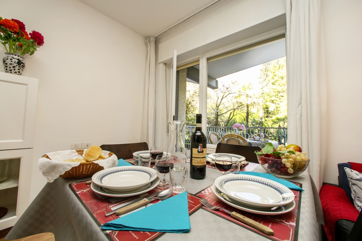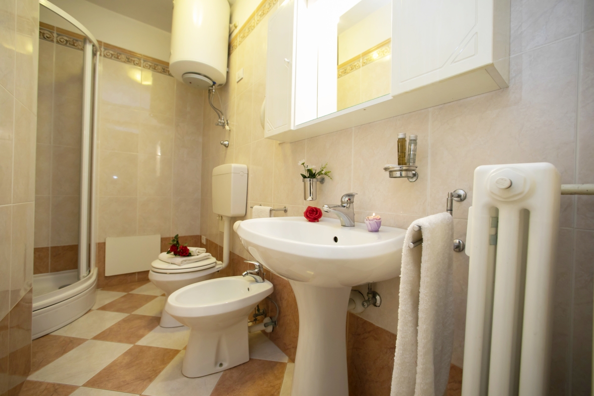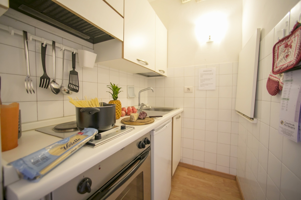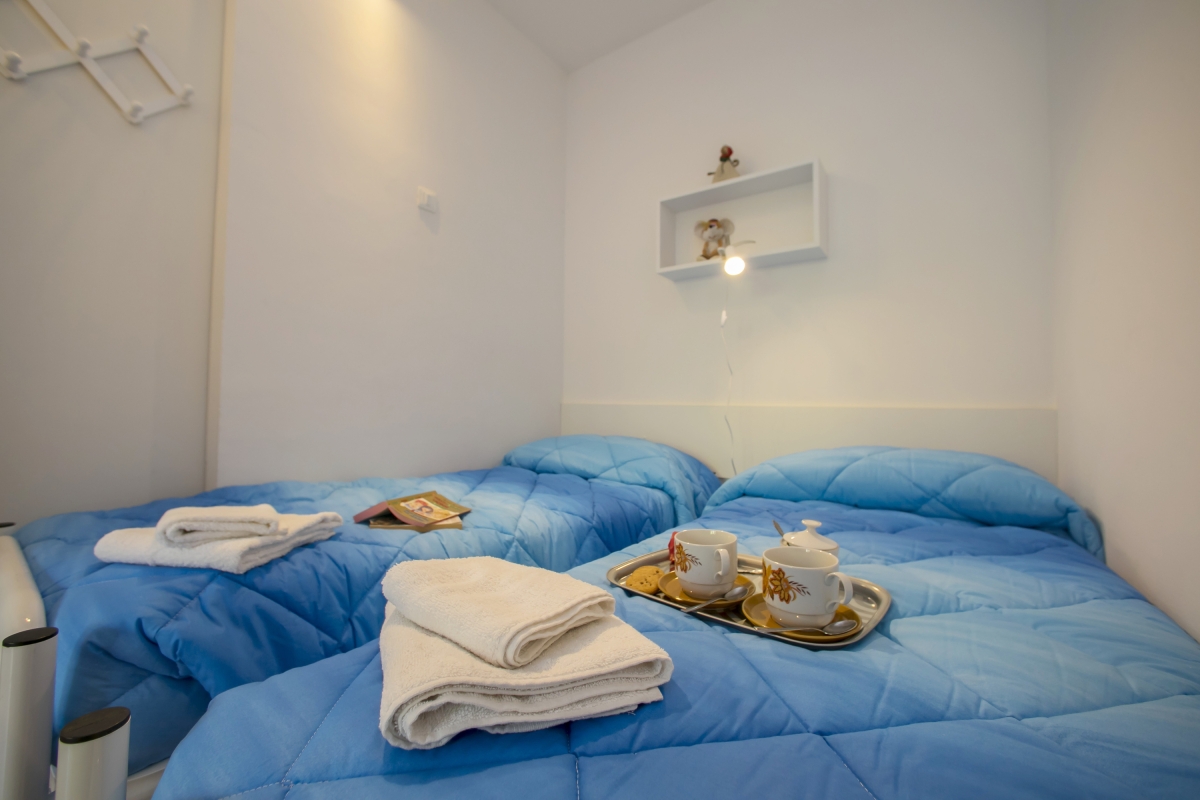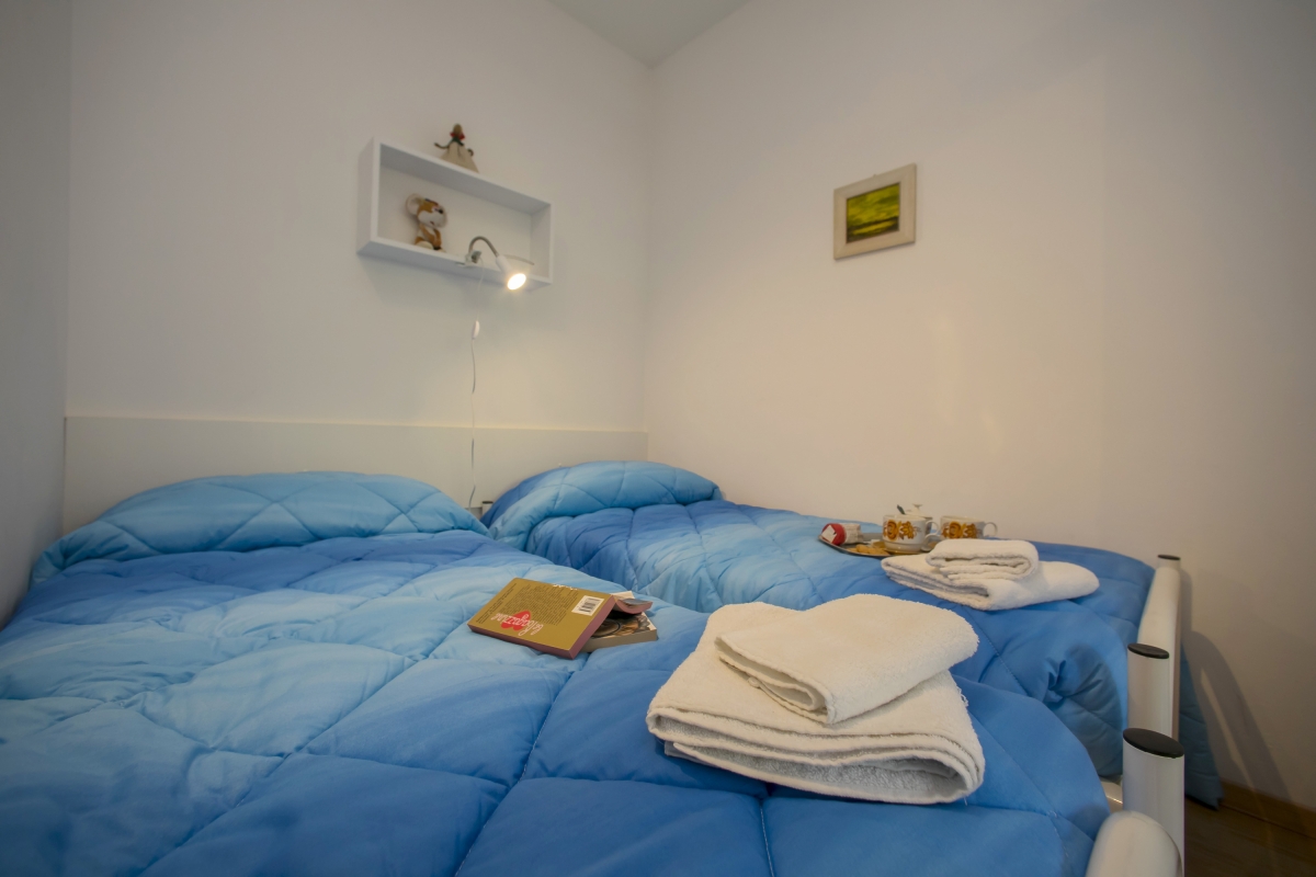 Inside, the 1st floor apartment is ideal for groups and families of 4. A functional, air-conditioned living space features a comfy sofa with wall-mounted flat screen TV, a dining area for 4 and access to a scenic private balcony. An adjoining kitchenette enables guests to enjoy a morning coffee or laid-back home-cooked meal together. There is a moka for coffee and a Moulinex coffee maker for American coffee.