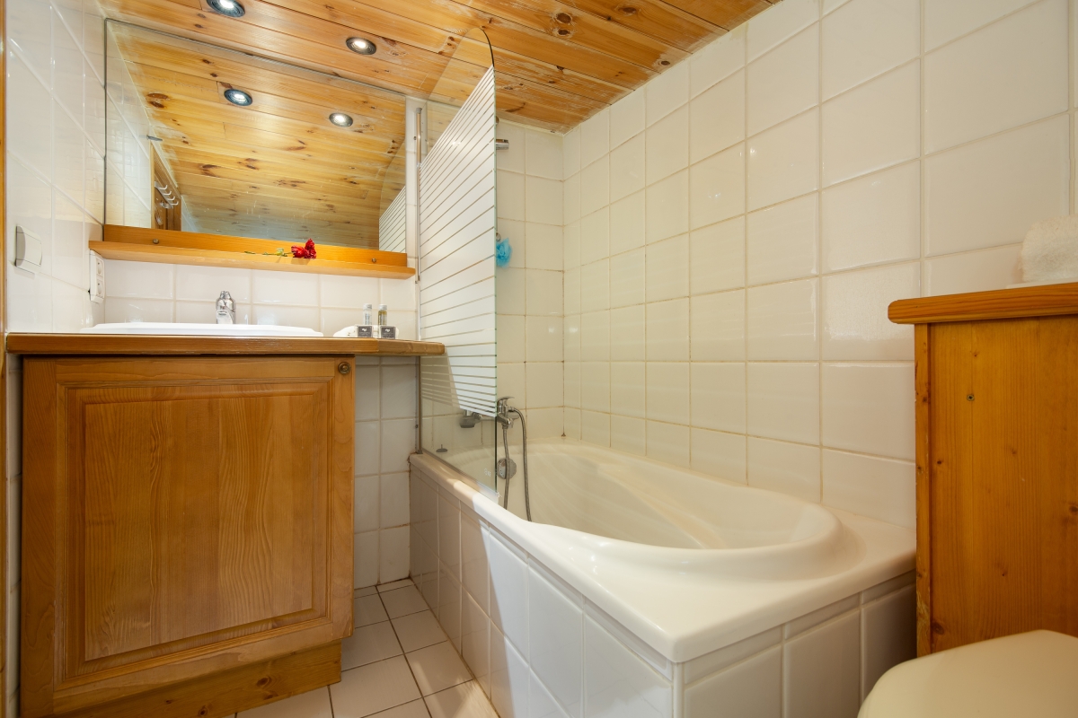 Bathroom 1: A charming family suite with low ceiling, equipped with a bath tub, overhead shower & wash basin