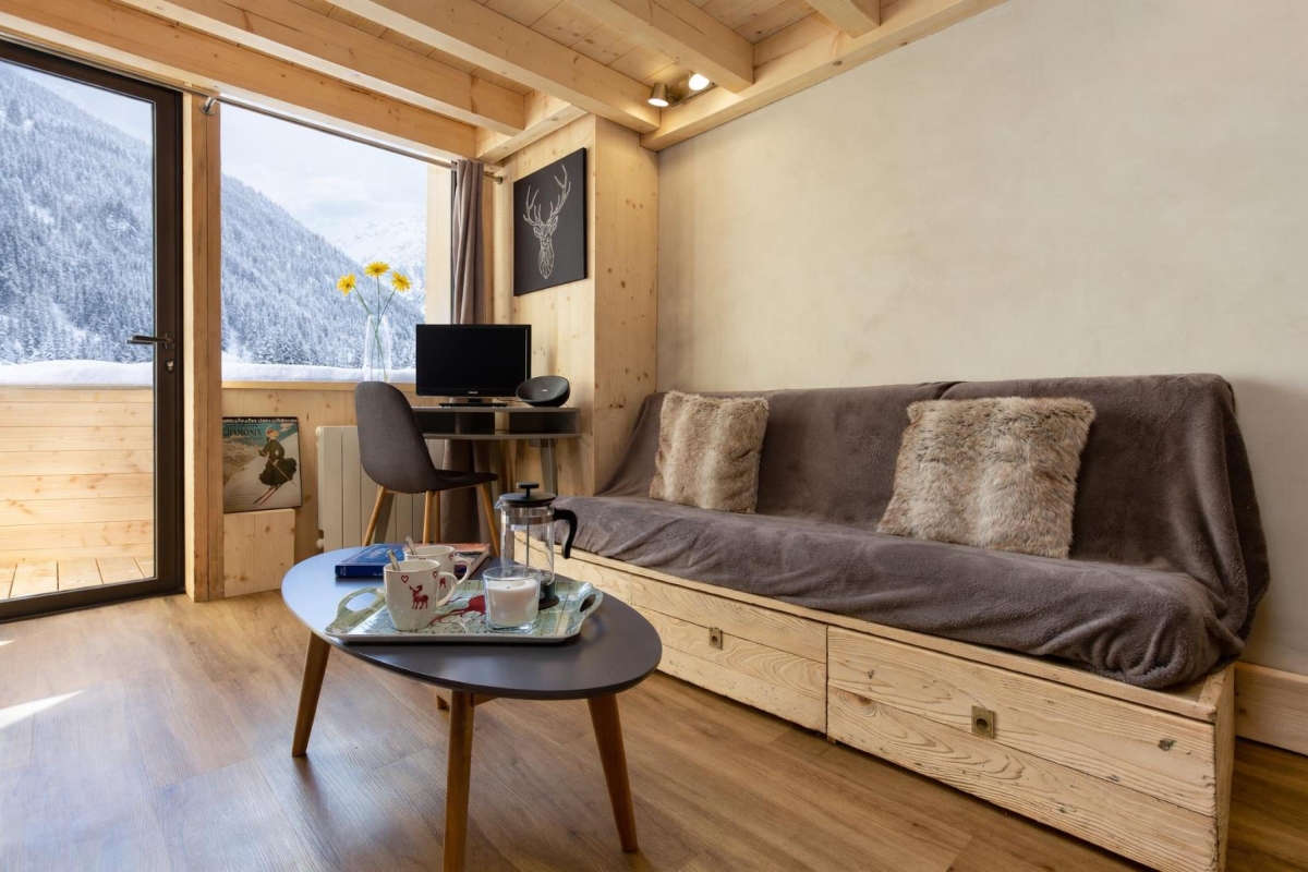 Situated in a natural riverside setting along ‘Chemin sous la Grand’ at the entrance of the village, guests are conveniently placed for reaching a local Pizza restaurant, a launderette and the Happy Holiday Homes office (1-minute walk away), alongside the Les Grands Montets ski lift (230 metres) and the nearby train station.