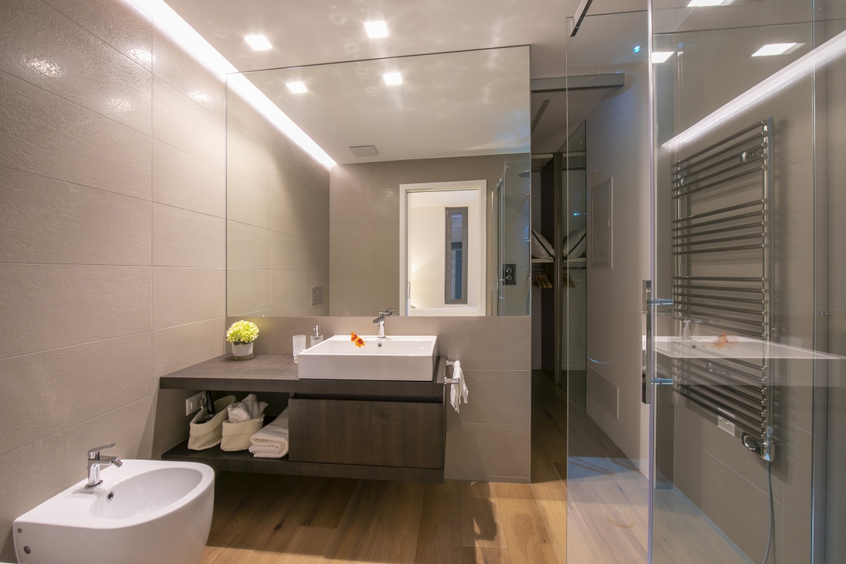 Bathroom 1: A sleek en-suite with ambient-lit walk-in shower, wash basin, WC & bidet
