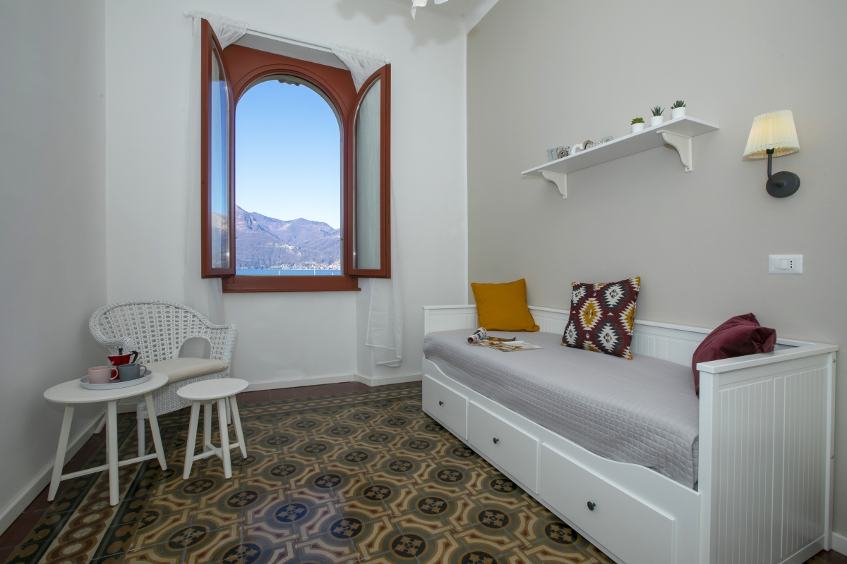 Bedroom 1: A flexible guest room with a single bed & extra pull-out single, a wardrobe & lake views