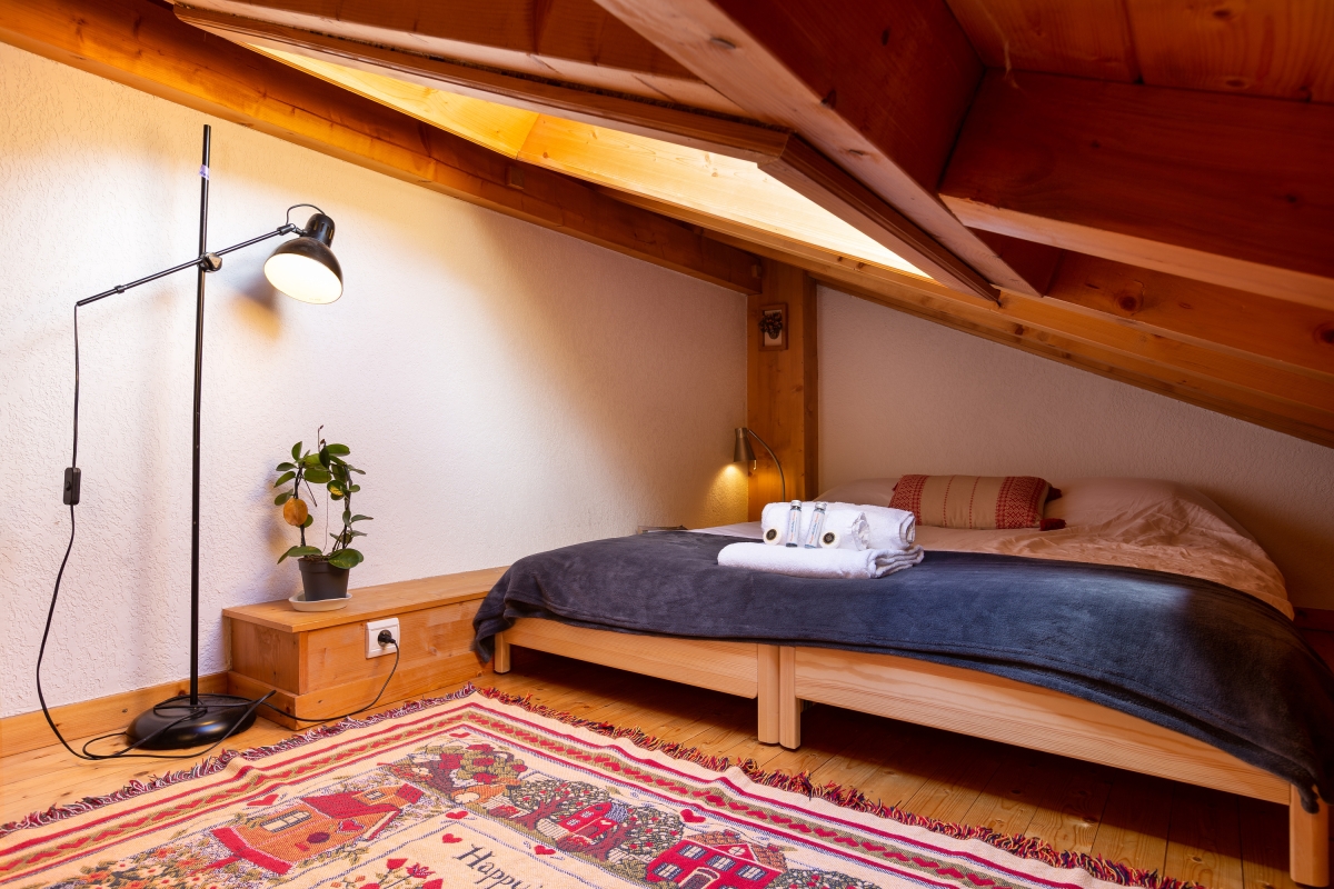 Situated in a lovely chalet nestled within a beautiful communal mountain-view garden, this 2-bedroom apartment with extra open mezzanine floor offers welcome flexibility for families and groups of 6.