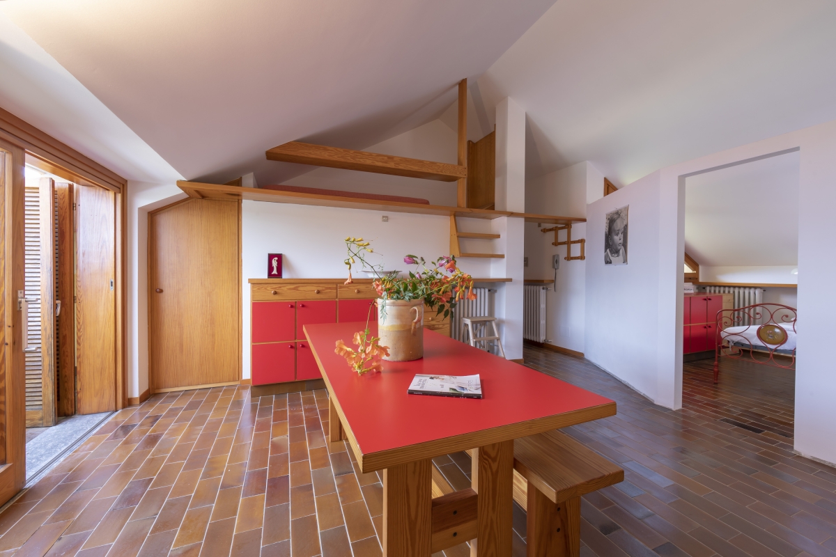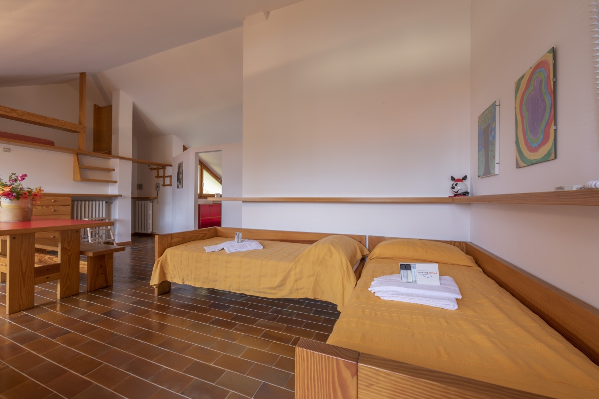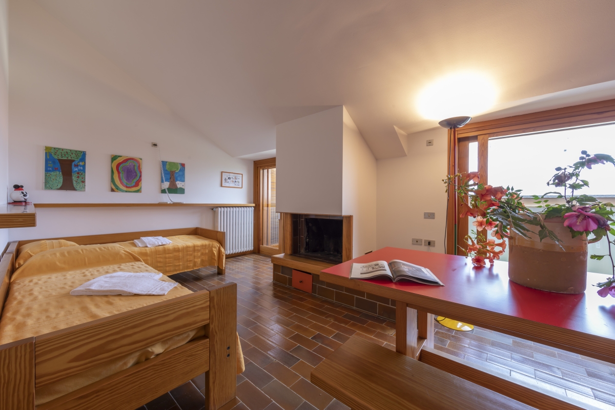 Its living room has two single sofa beds, a fireplace, a wooden dining table and an open kitchen. This well-ventilated room opens into the terrace and has a bright and lively ambiance that exudes freshness. The modular kitchen is equipped with a Moka coffee machine, a dishwasher, an oven, a toaster, a cooker hob, an electric kettle and a fridge.
