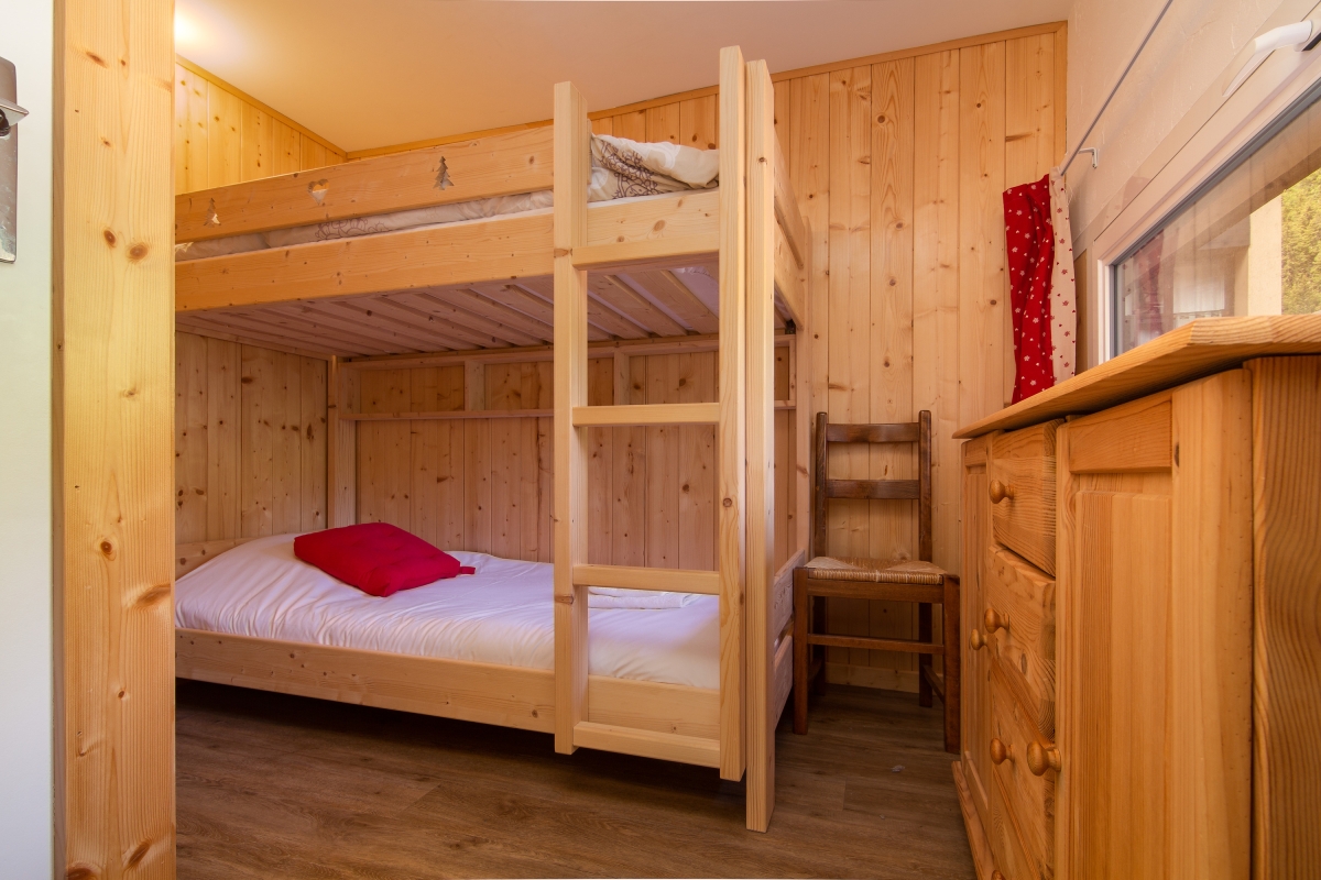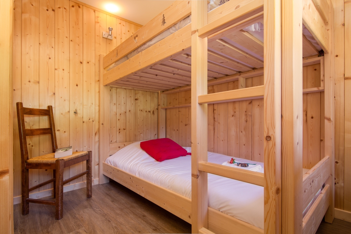 Bedroom 2: The room with wooden walls has a set of bunk beds.