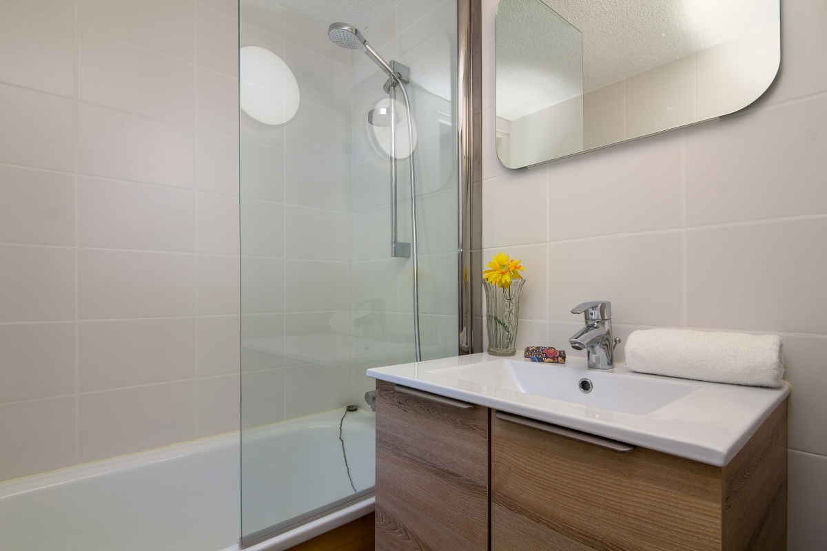 Bathroom 1: The modern bathroom suite has a bath with an overhead shower and a washbasin.
