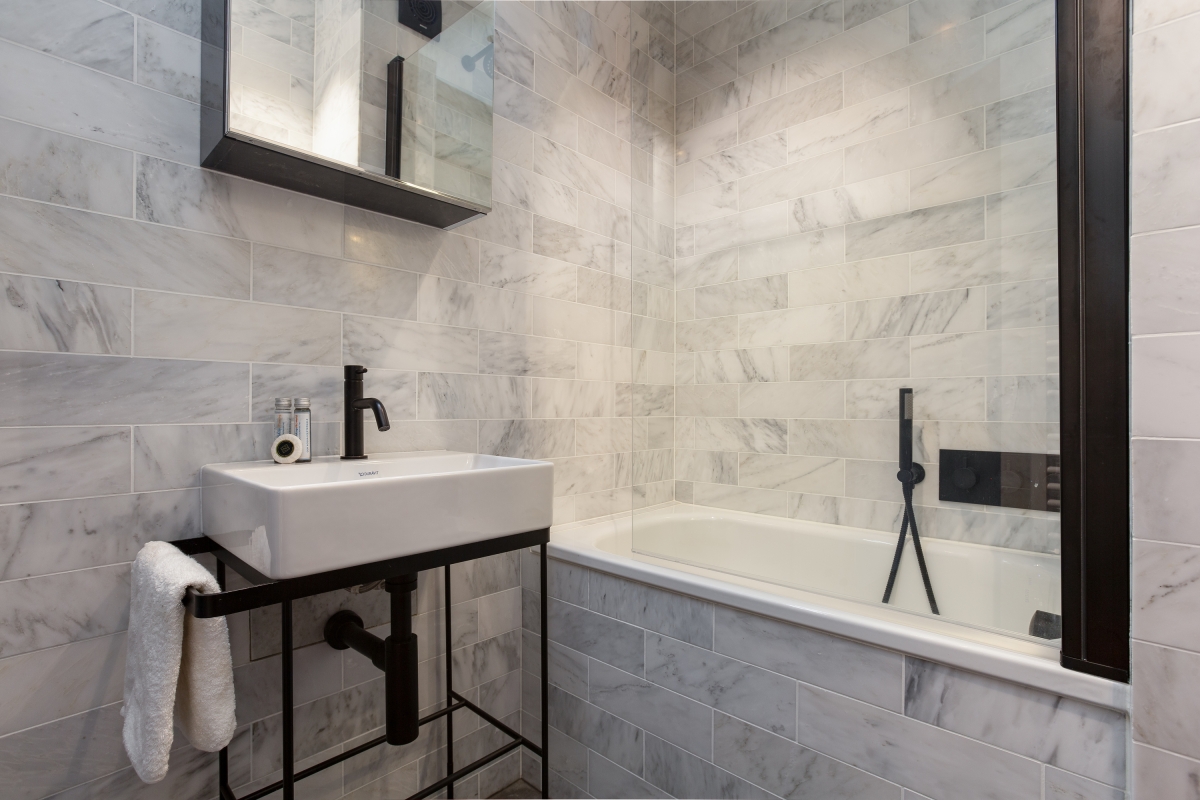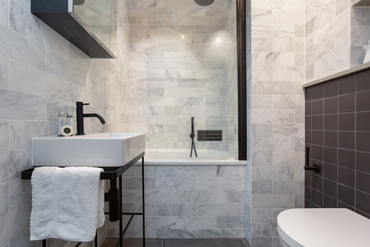 Bathroom 1: Chic modern suite with bath, overhead shower, WC, basin & underfloor heating