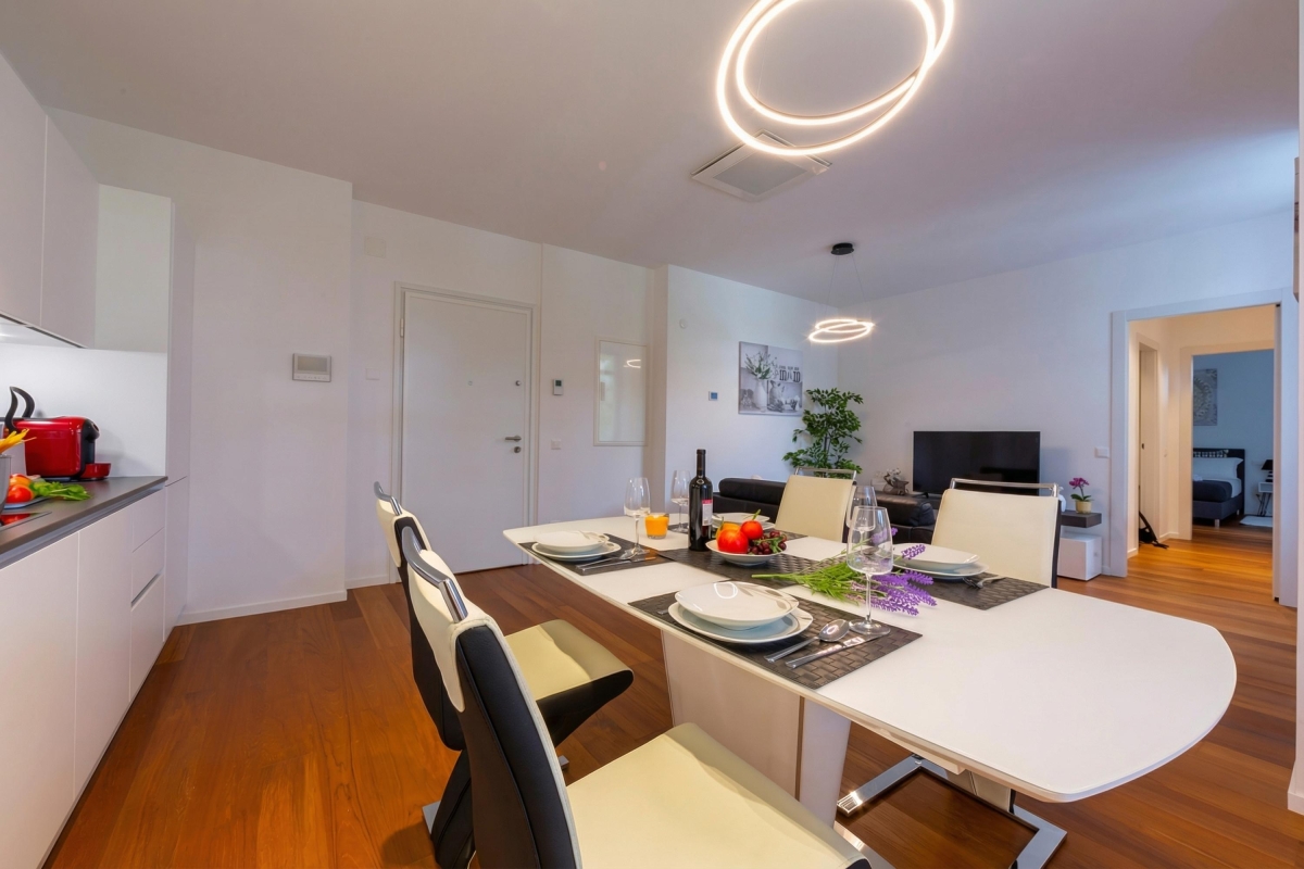 Appartamento molto bello , ben fornito , posizione strategica al centro di Lugano in pochi passi hai tutto quello che ti serve , bar supermercato ristoranti .Response: