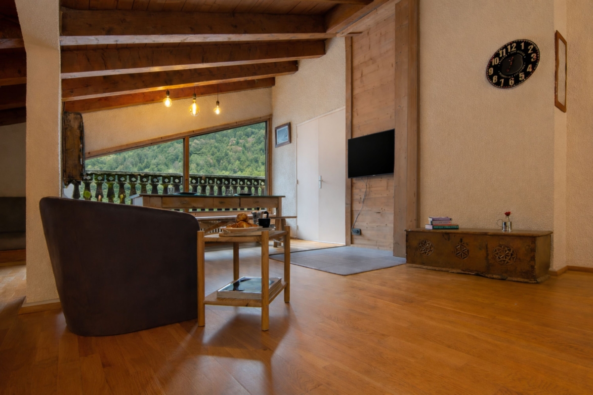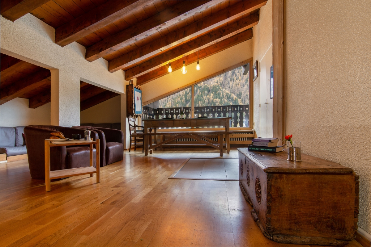 The spacious 5th floor apartment features in a 5-storey residence with shared access to a garden and sahred heated outdoor swimming pool (open 1 July – 31 August). Surrounded by woodland, the charming location places guests 300 metres from the Lognan ski lift.