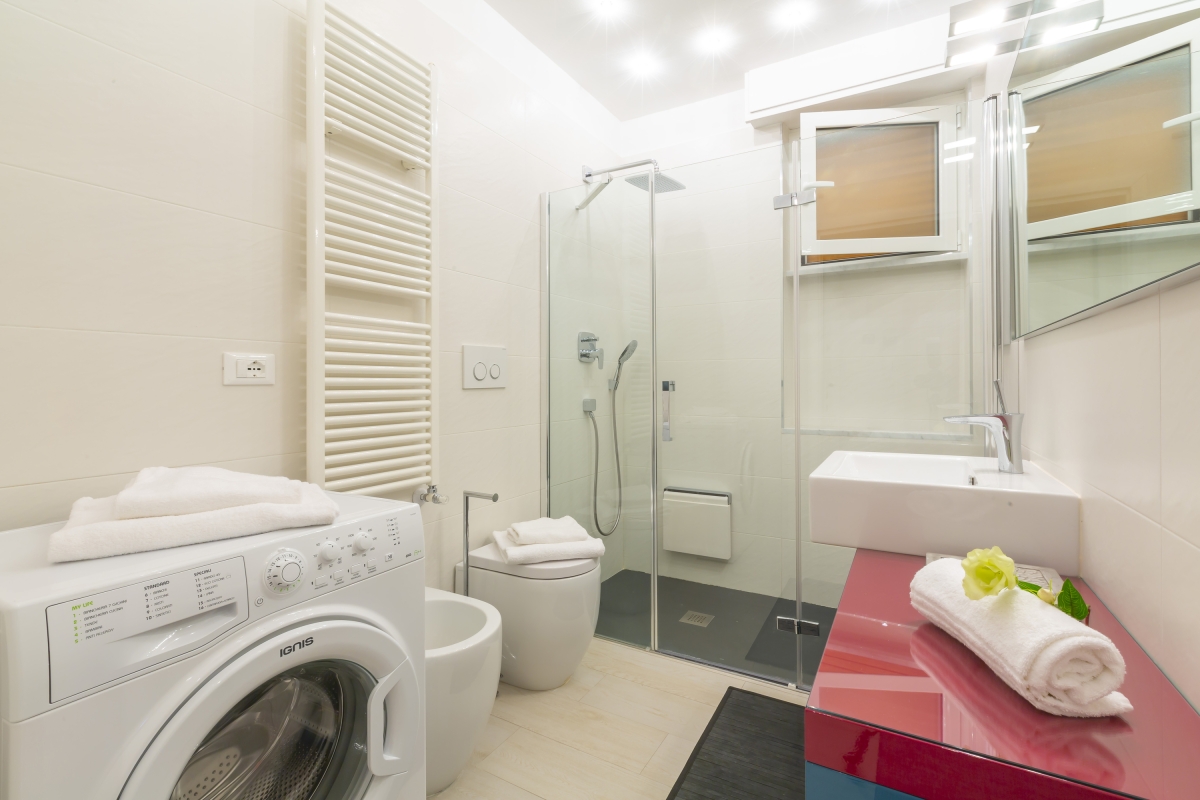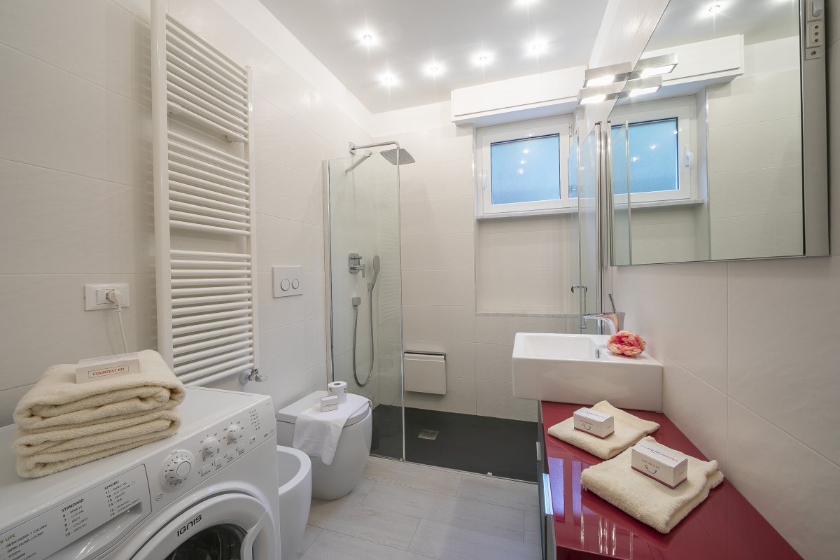 Bathroom 1: A contemporary-fitted suite with walk-in shower, basin, WC, bidet & washing machine