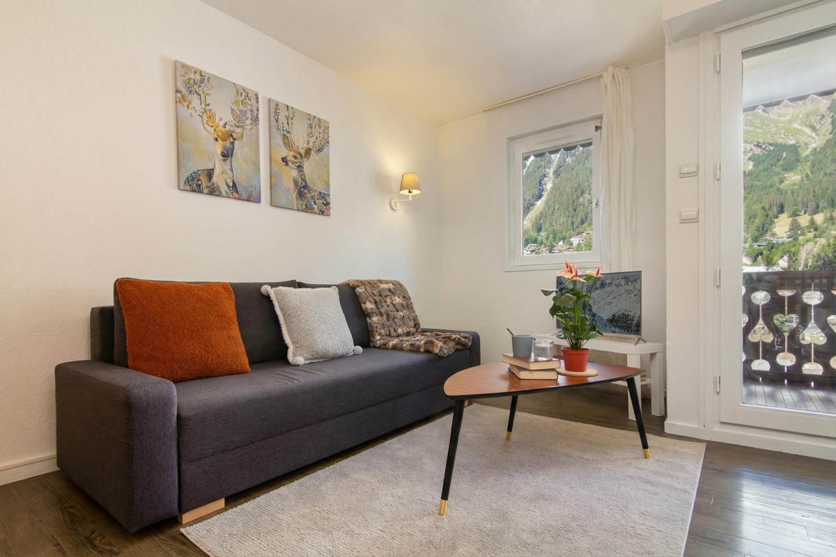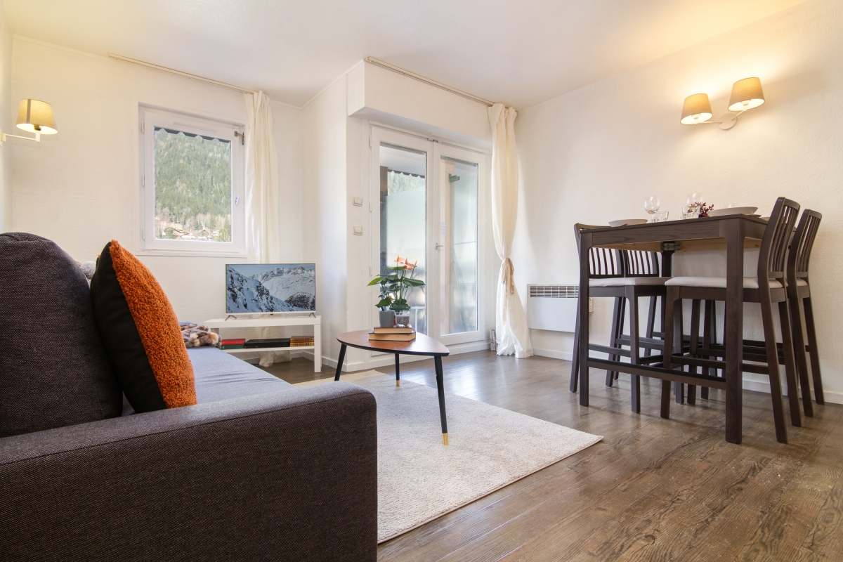 Conveniently placed in Chamonix Sud, this uplifting studio with flexible layout offers the perfect budget-friendly holiday base for couples and family groups of 4. Inside, the WiFi-enabled apartment benefits from a light and airy living space, furnished with a flat screen Smart-TV, modern double sofa bed and a dining area for 4, with accompanying kitchenette, complete with electric hob, dishwasher, fridge. The living room also leads out onto a mountain view balcony, which is furnished with a bistro dining set for 2. Accompanying the double sofa bed in the living room is a child-friendly set of bunk beds in the adjoining hallway. A contemporary-fitted bathroom with tub and overhead shower offers added convenience whilst away.