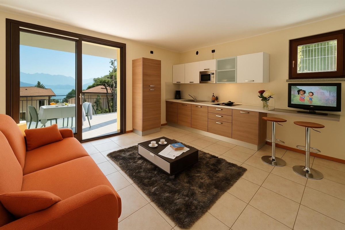 From the living room glass doors slide out onto a gorgeous private balcony terrace which features an alfresco dining ideal for memorable dinner parties! The views feature the hillside of Argegno, the famous Isola Comacina and the breathtaking lake with its dramatic mountain tops.