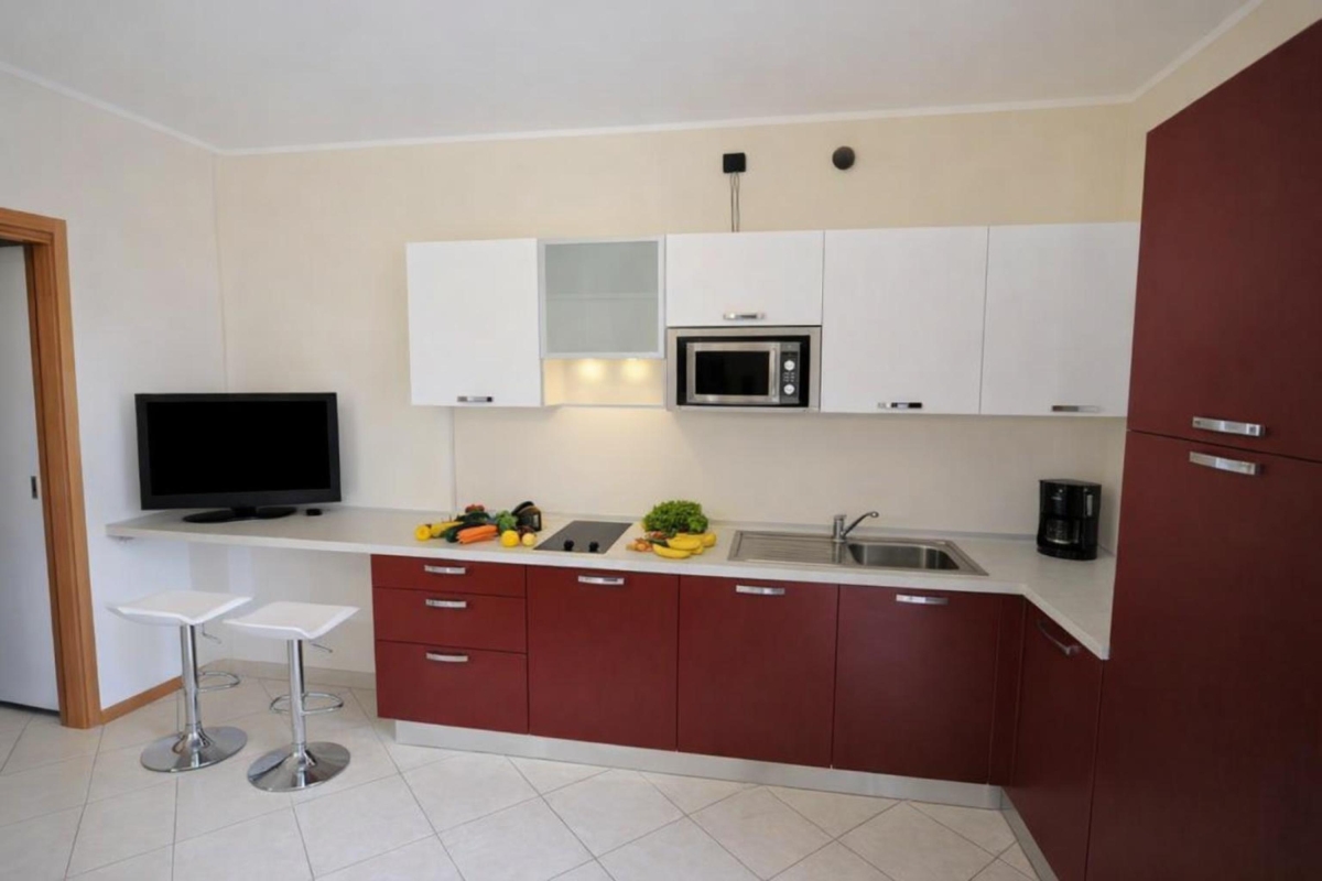 The ground floor property boasts a spacious and bright open plan living area which features a comfortable sofa, a large new flat screen TV to enjoy and a stunning fully fitted Kitchen with breakfast bar and stools which offers all the desired appliances for a self-catering holiday. The living room also boasts direct views over the small and exclusive residence as well as of the Lake and mountains, providing a fantastic backdrop with a loved one and a glass of wine during your stay!