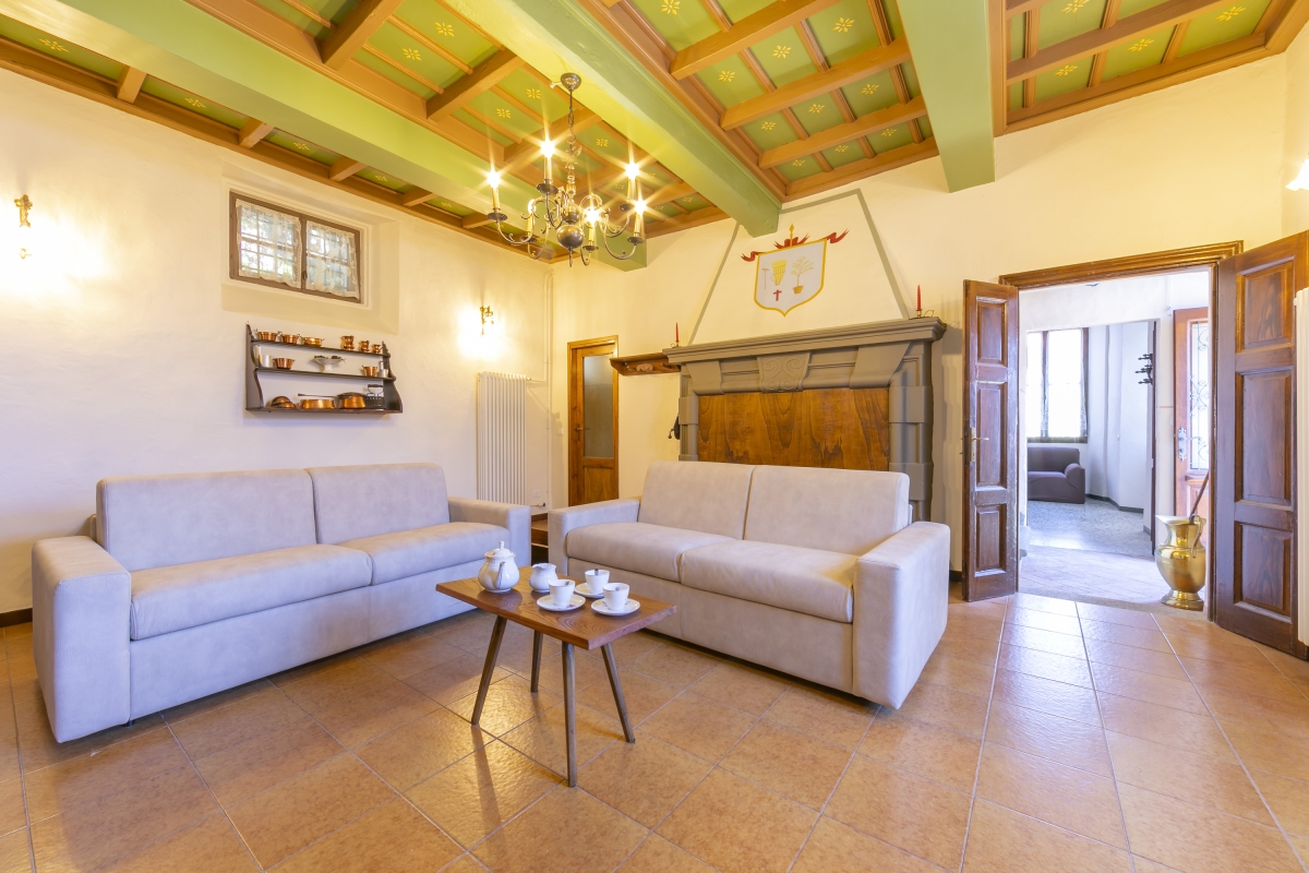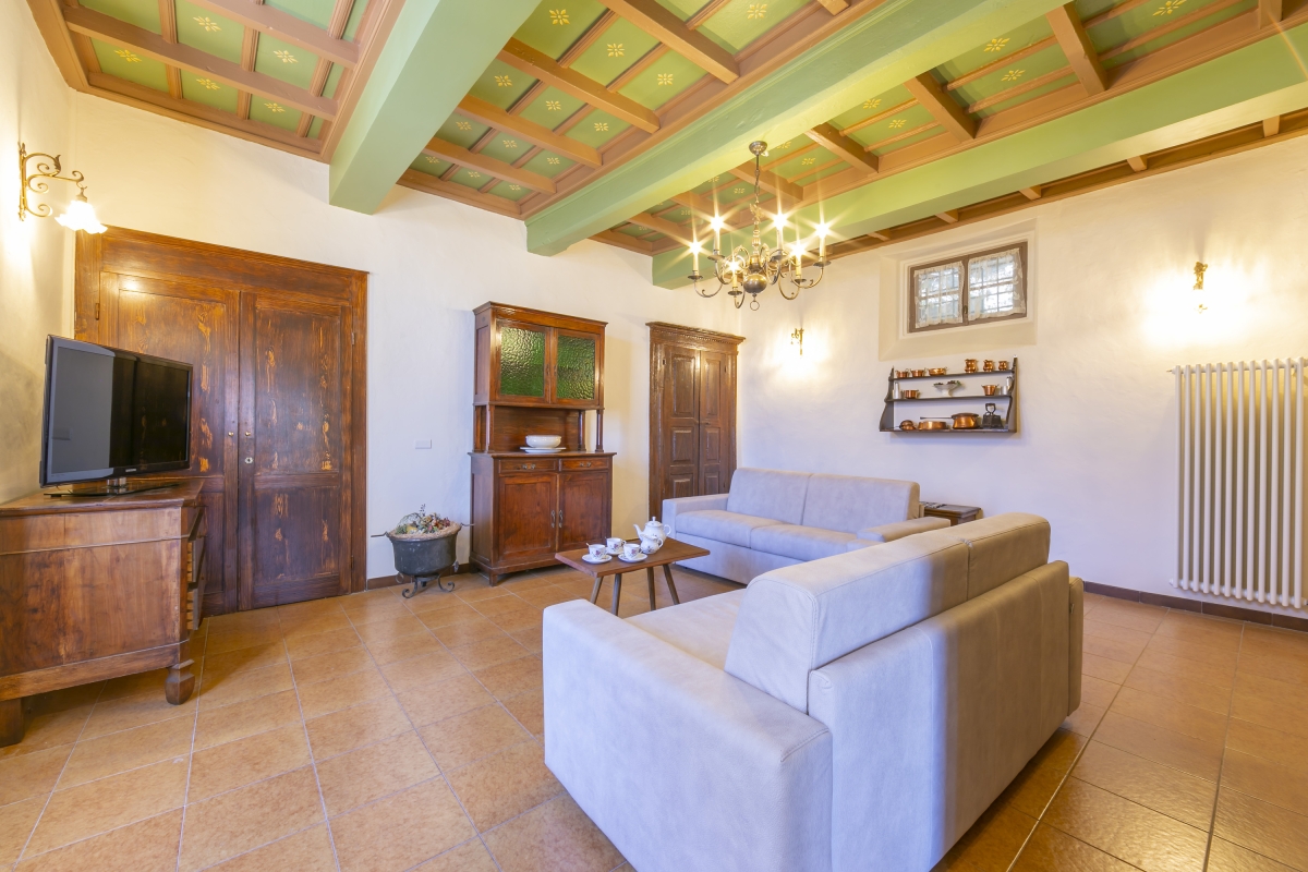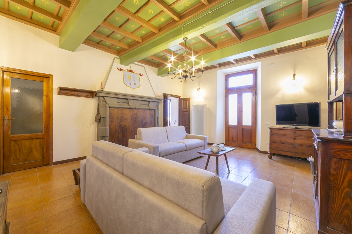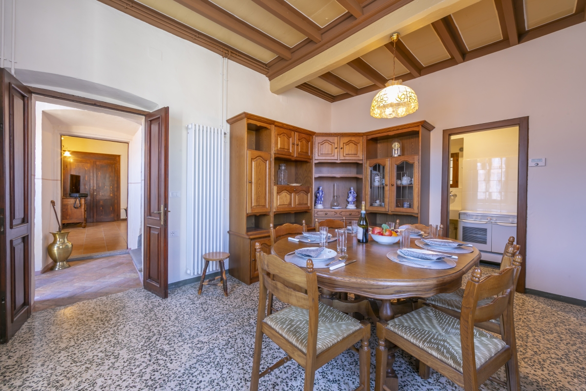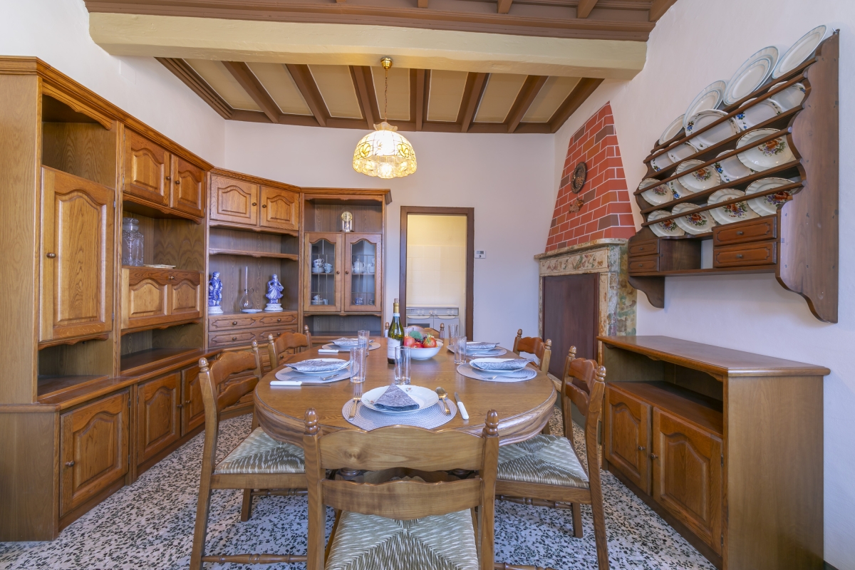 The spacious living room, to the left of the front hallway, manages to be grand and cosy at the same time. It has two double sofas and some traditional wooden furniture, plus a large flatscreen TV. The painted, beamed ceiling is delightful, as are the other touches around the room, including the coat of arms painted on the chimney breast. Doors in the living room lead out onto a private terrace to enjoy the view.