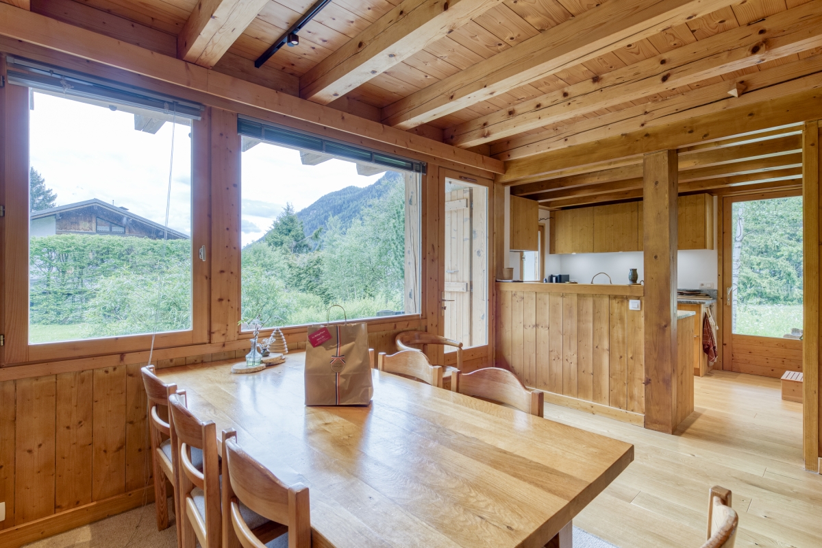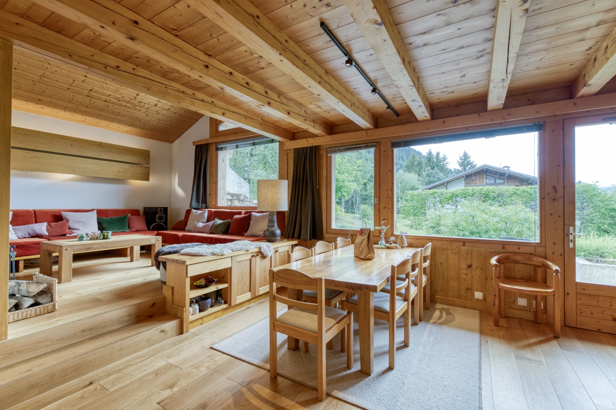 Built in 1990 and renovated in 2022, the chalet combines classic mountain charm with subtle 1960s architectural influences. It comfortably accommodates up to 10 guests and is ideal for families or groups. The fully equipped kitchen opens onto the dining and living area and includes modern appliances such as a dishwasher, oven, microwave, gas hob, Nespresso coffee machine, American fridge, freezer, food processor, toaster, kettle, and range cooker. The dining table seats eight guests and can extend to accommodate ten. The kitchen also leads to a shaded south-facing terrace for outdoor dining.