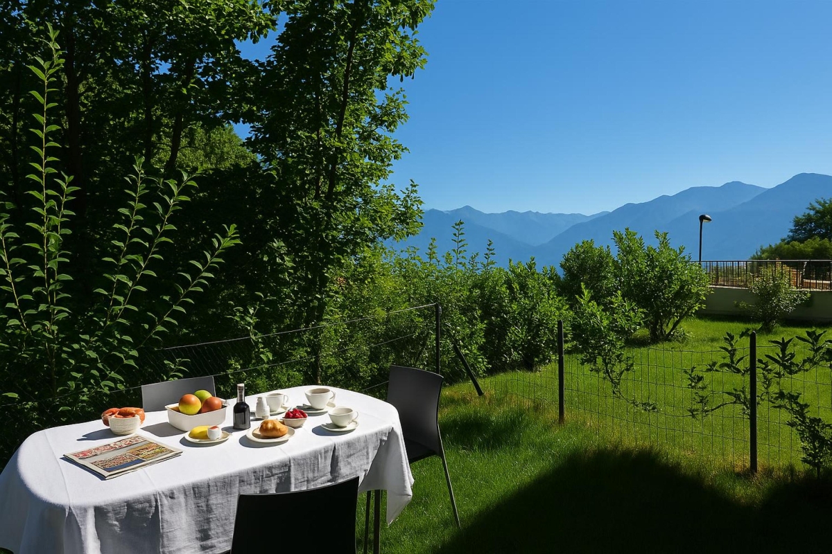 The property features a lovely open plan living room which provides a very comfortable and stylish place to relax and unwind with a flat screen TV for guest’s entertainment. A newly fitted contemporary kitchen provides all the desired appliances for a smooth self-catering holiday including a gas hob and oven, toaster, microwave, coffee machine, dishwasher and a washing machine for guest’s convenience. From the open plan living room glass doors slide out onto a wonderful private sunny garden with alfresco dining terrace area and boasting lake and mountain views of Isola Comacina!