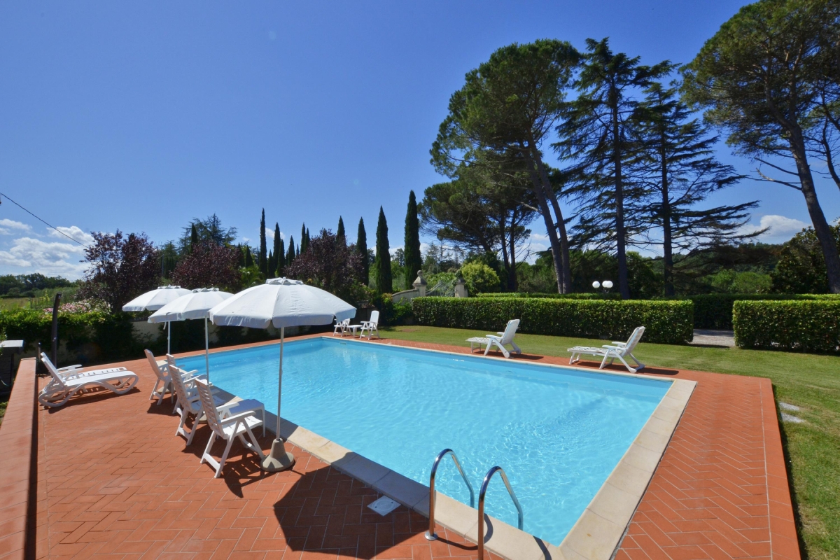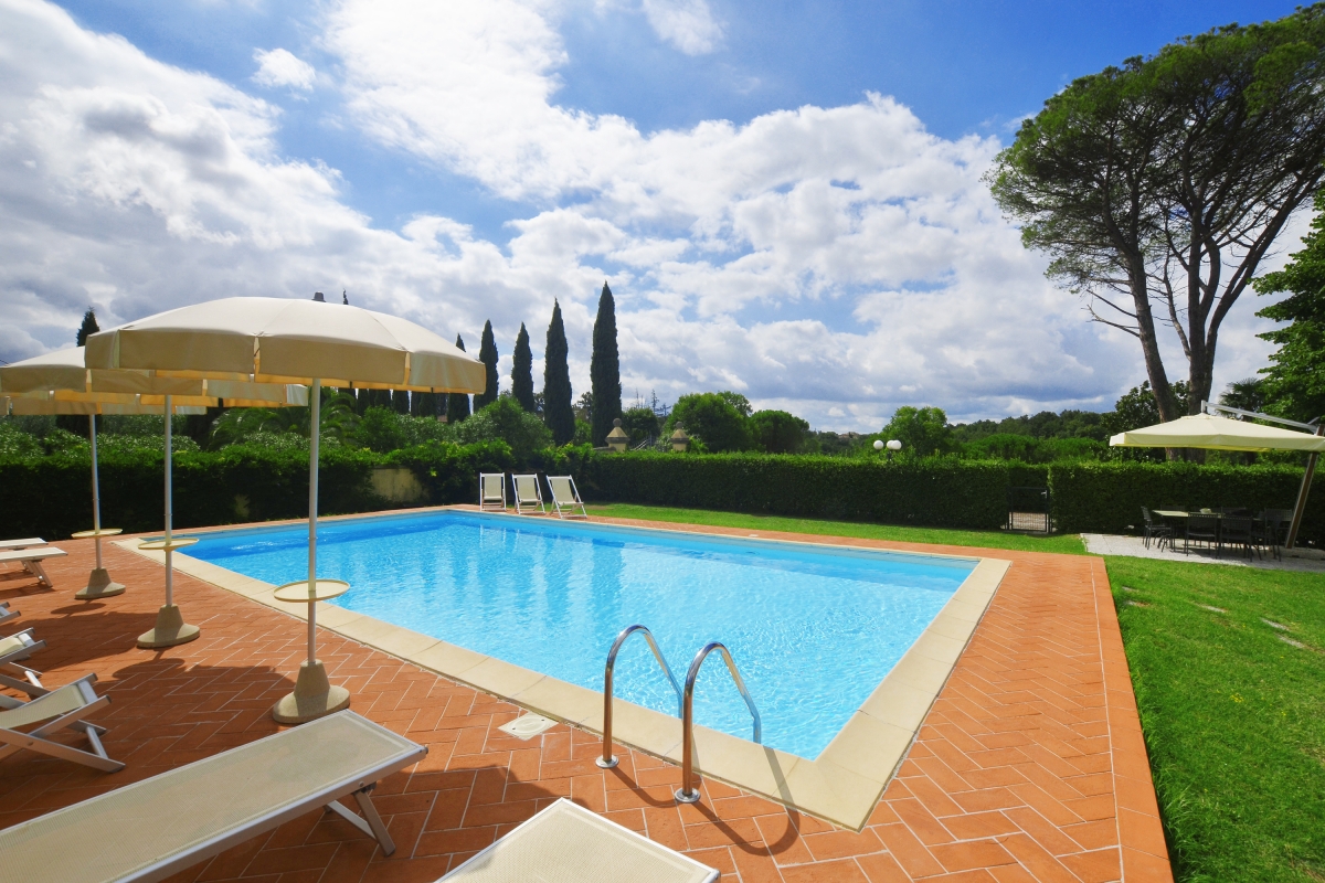 An exclusive holiday retreat for up to 10 guests, the villa on the green Tuscan hills near the Tyrrhenian coast is a destination in itself. The garden in front is styled in the manner of a typical Italian garden and is almost exclusively at the disposal of guests. A large open-air swimming pool (dimension: 6 x 12 m, depth 110-150 cm) with sun loungers await the guests to relieve them off their stress in the pleasant weather of central Tuscany.