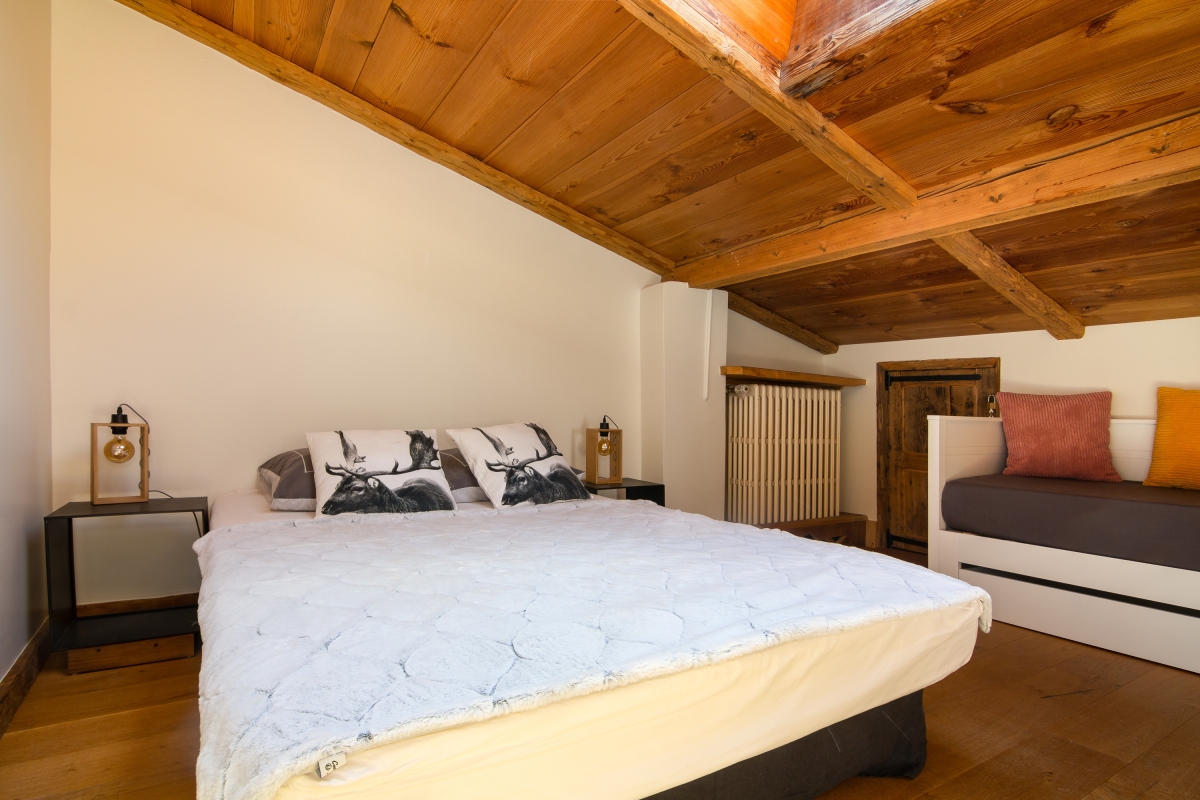The elegant two-bedroom apartment on the top floor has a charming wooden roof and an inviting décor. The spacious living room is thoughtfully divided into sections dedicated to the living area, dining area and an open kitchen. The snug living area under the sloped ceiling and a skylight has a large sofa, a pair of modern armchairs, a flat-screen TV and a nested coffee table set. The dining area on the other side of the fireplace has eight seats. The kitchen with wooden cabinets is equipped with a dishwasher, a coffee machine, a microwave, an oven, a range cooker, a toaster, an electric kettle and a fridge.
