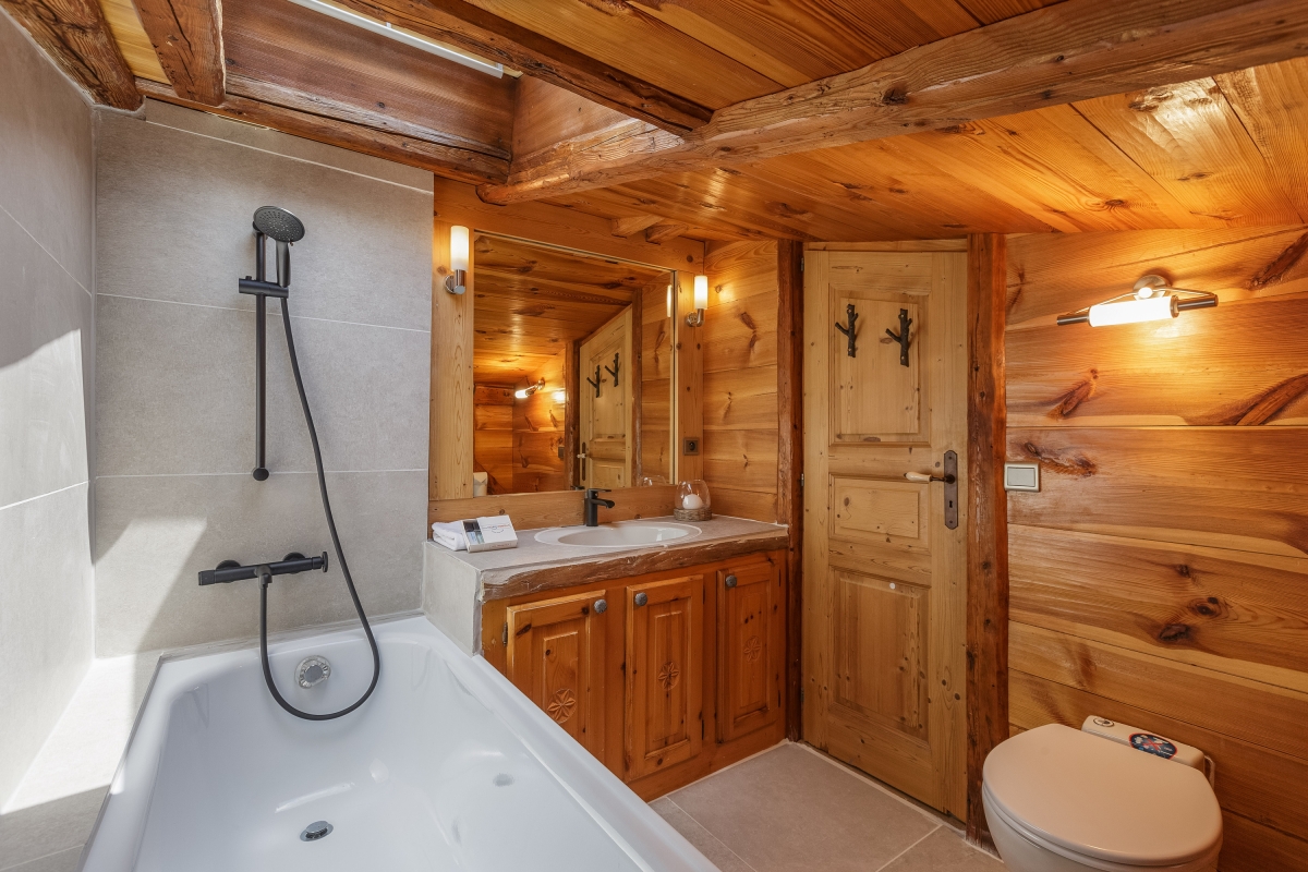 Bathroom 2: The modern en-suite bathroom has a bathtub with an overhead shower, a washbasin, and a WC.
