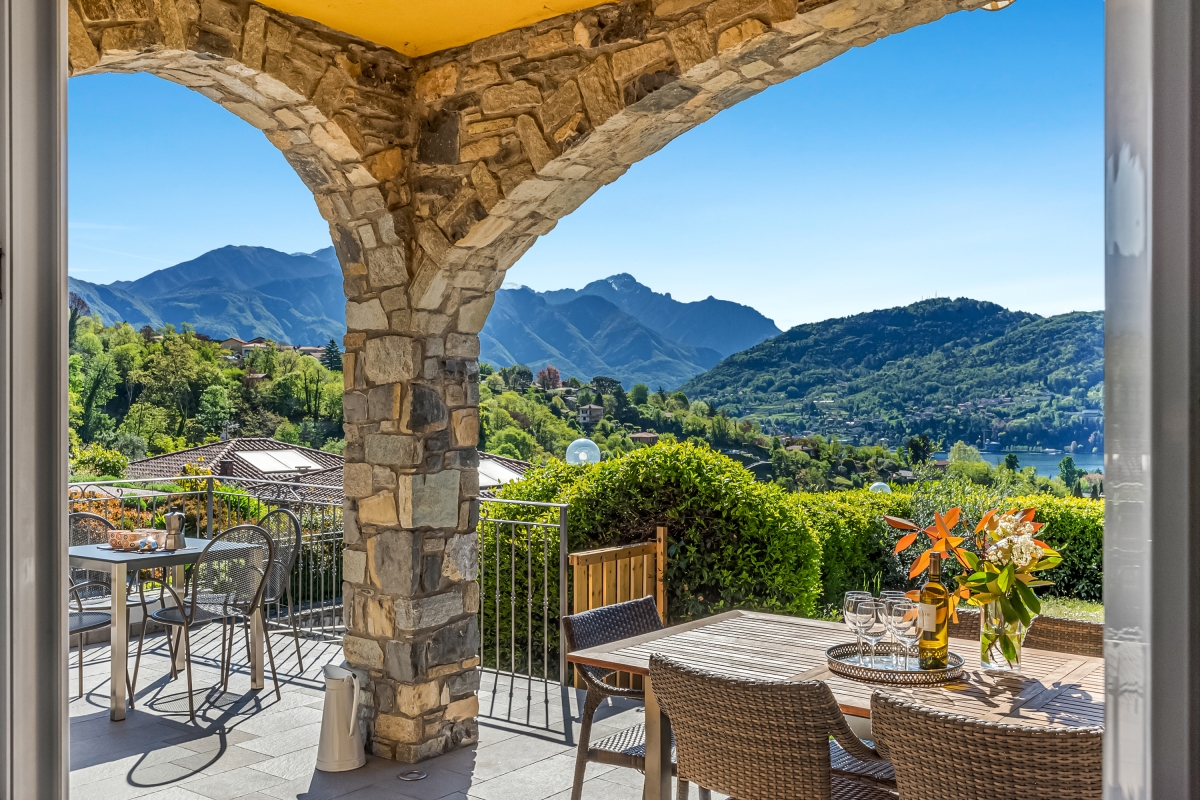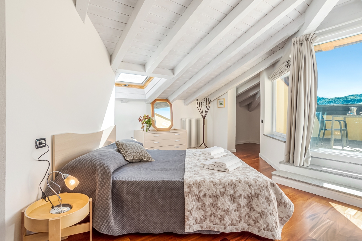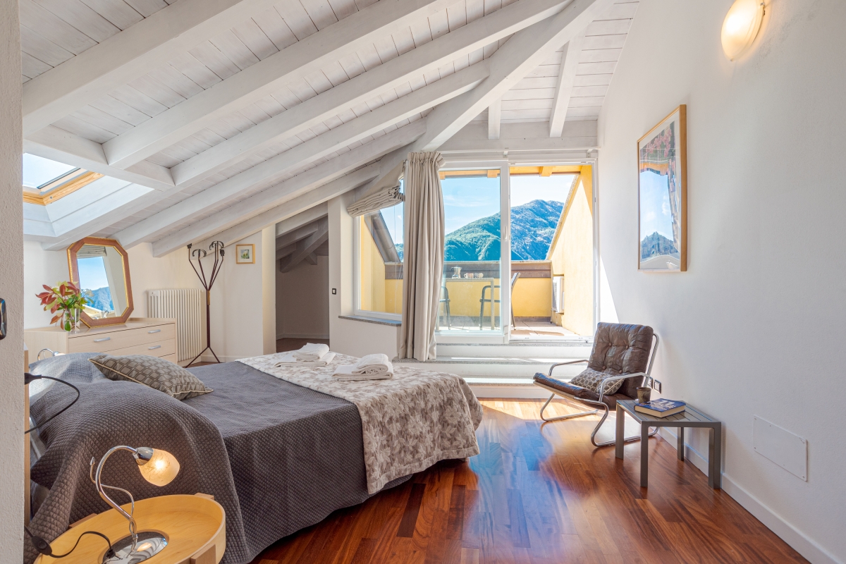 From the living room guests can access the sunny garden which is wonderfully positioned with lake and mountain views and which offers a portico terrace with a covered alfresco dining set and BBQ and a well maintained and child-friendly lawn with a slight and gradual slope. The side terrace with steps leads to a fabulous shared outdoor swimming pool with sun loungers (the pool is shared with only one other apartment); perfect for relaxation with a good book and glass of wine!