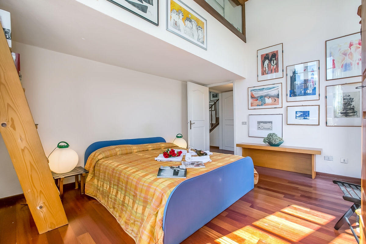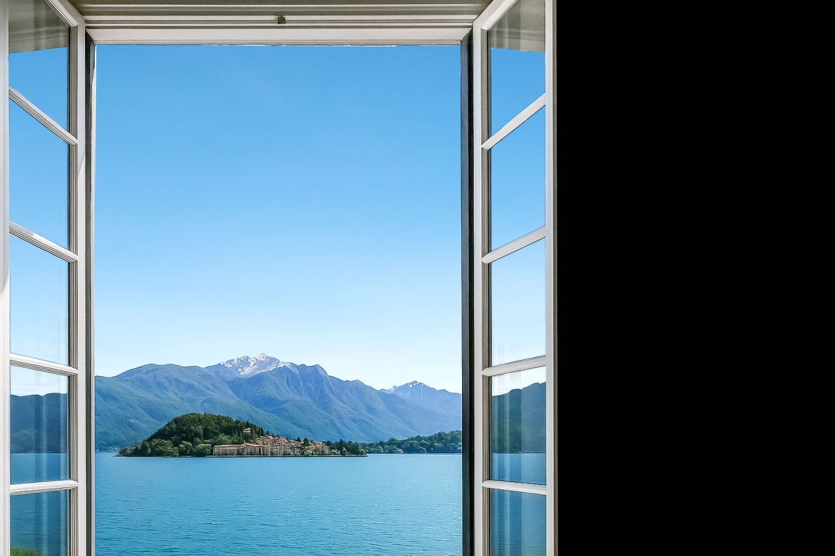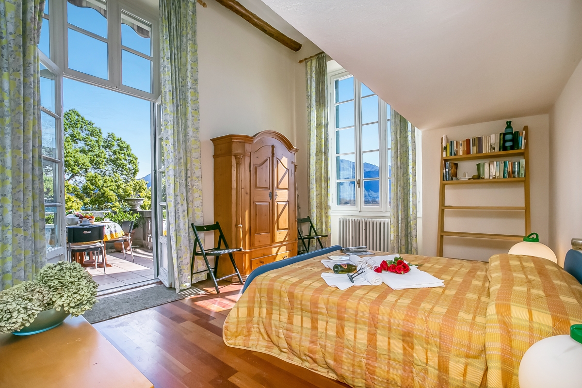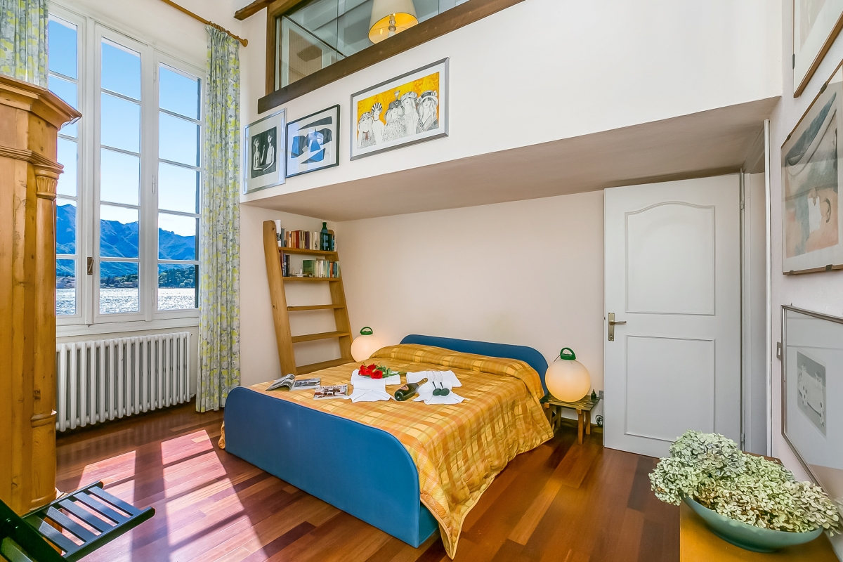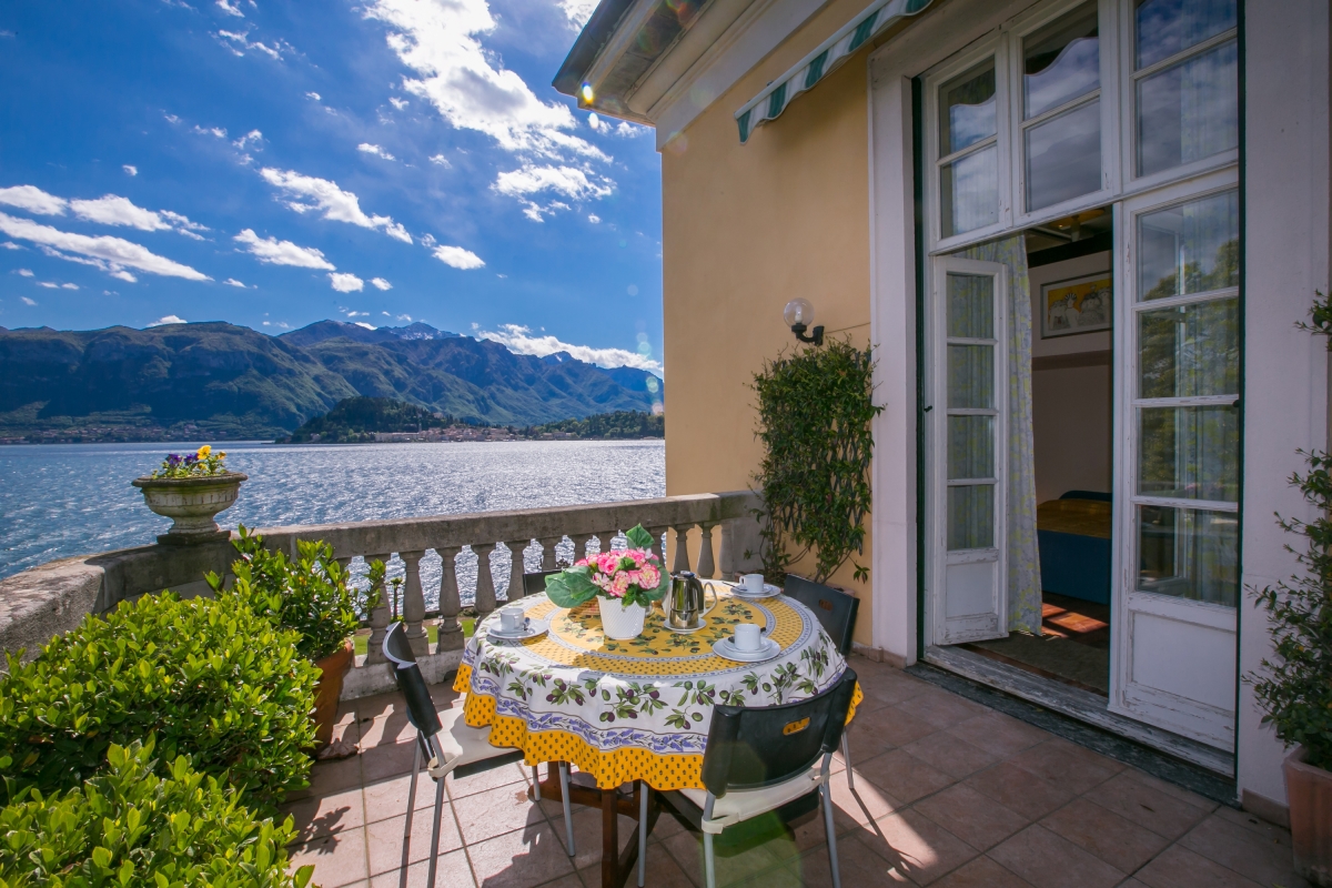 Bedroom 1: This bedroom features a double bed and wardrobe. Large windows overlook the lake, and French doors open onto a sunny private balcony with outdoor dining space and sweeping views of the gardens, Bellagio, and Varenna.