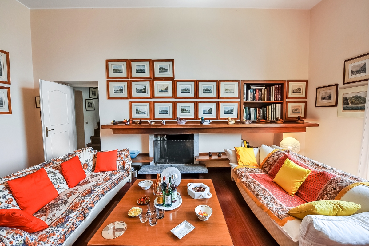 Located on the second floor of the historic villa, the apartment comfortably hosts up to 4 guests with a refined yet welcoming ambiance. The spacious lake-view living room features three plush sofas, a TV, and a dining area framed by views of the Bellagio peninsula. Original art, antique furniture, and modern Italian flair create a unique atmosphere that’s both vibrant and restful.
