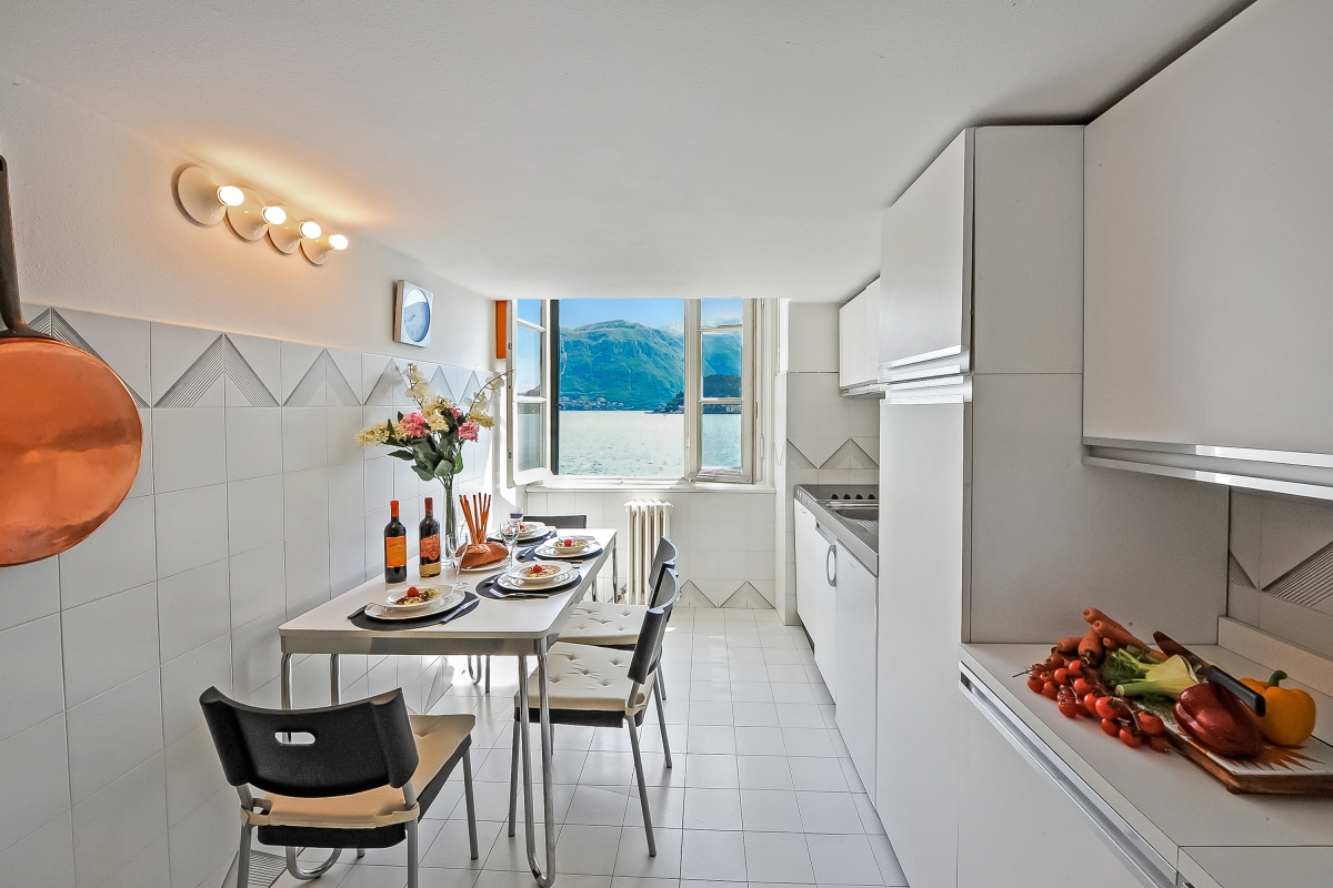 The fully equipped kitchen includes an induction hob, microwave, coffee machine, and a breakfast area overlooking the lake—ideal for relaxed holiday cooking.